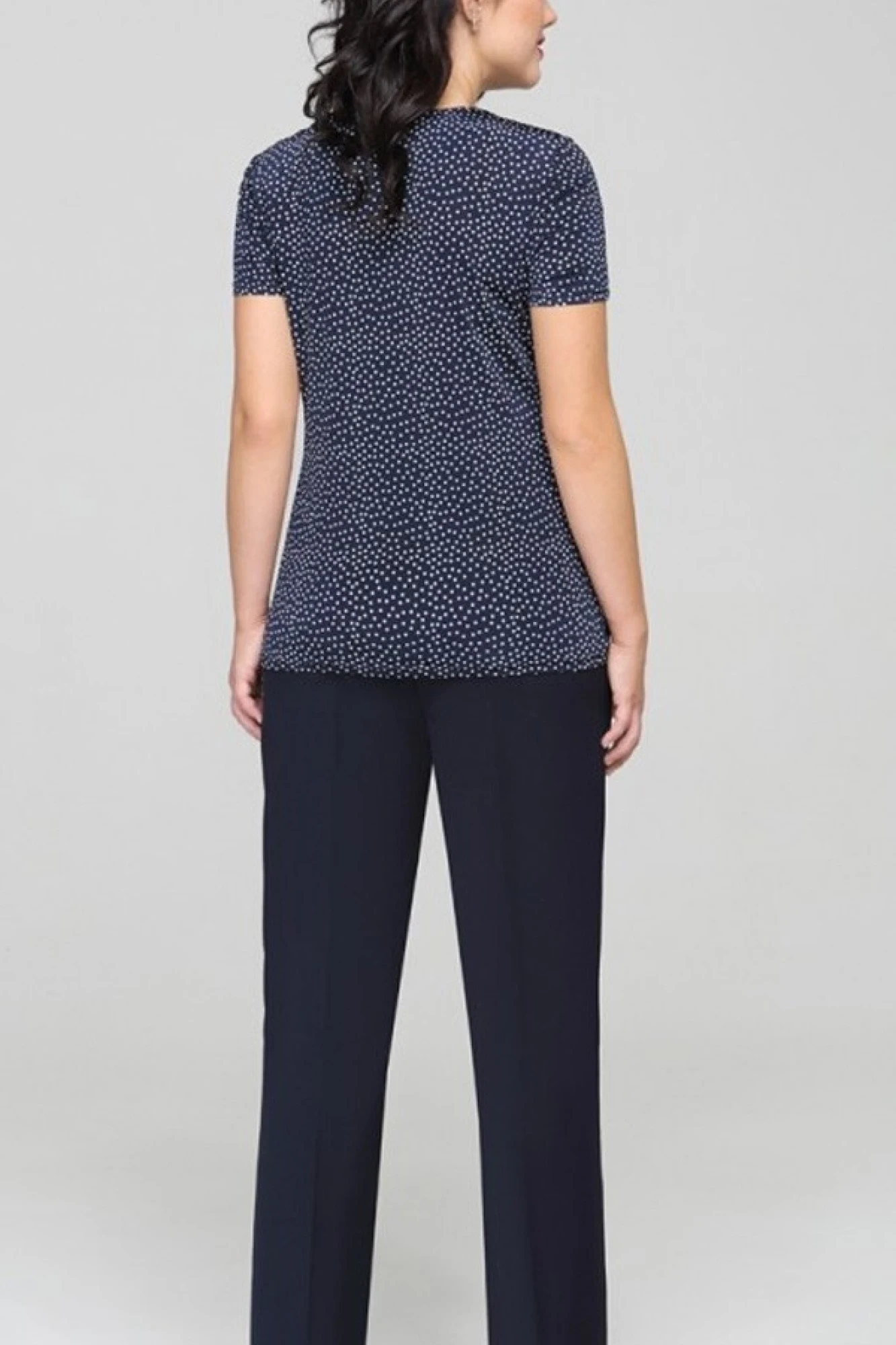 Костюм совершенно замечательный. Стройнит. Взяла на размер больше - сел как влитой. Но блузка сюда совершенно не в тему. Ношу с белым топом. Отлично! Спасибо!