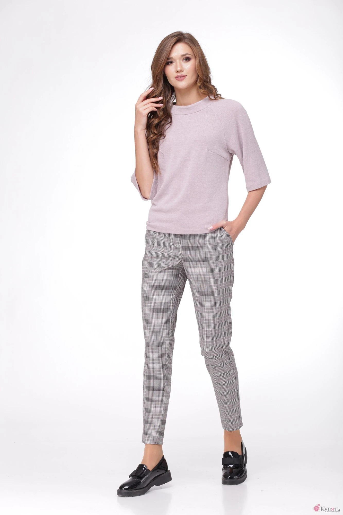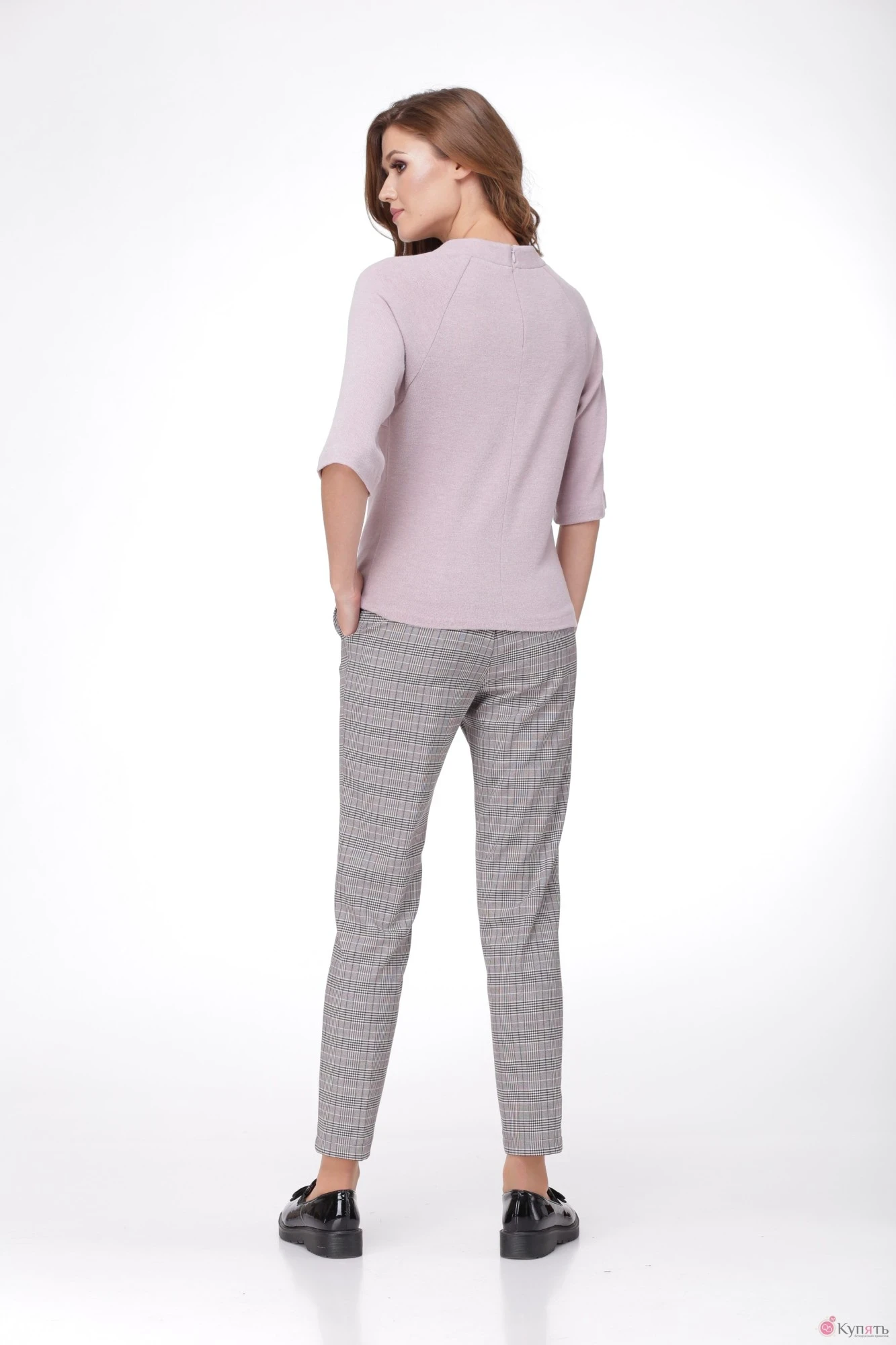 Комплект брючный, состоящий из блузона и брюк. Блузон изготовлен из мягкого трикотажного полотна. Блузон прилегающего силуэта , слегка расклешён к низу, с нагрудными вытачками на полочке. Спинка со средним швом. В среднем шве спинки потайная застёжка-молния. Горловина обработана стойкой-воронкой, высотой -3,5 см. Рукав - реглан, слегка расклешён к низу. Стильные брюки прилегающего силуэта с притачным поясом-кокеткой, шириной 4,5 см, на 1-у петлю-пуговицу и 2-мя боковыми карманами.
