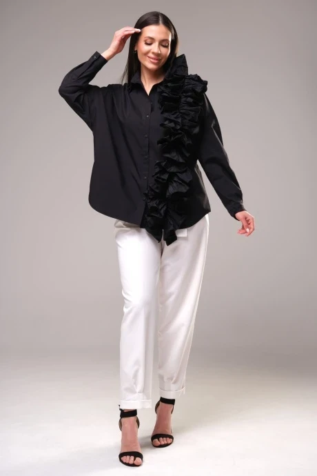 Шикарный комплект классических тонов черного и белого, состоящий из свободной блузы рубашечного кроя с вертикальной рюшей и современных брюк.