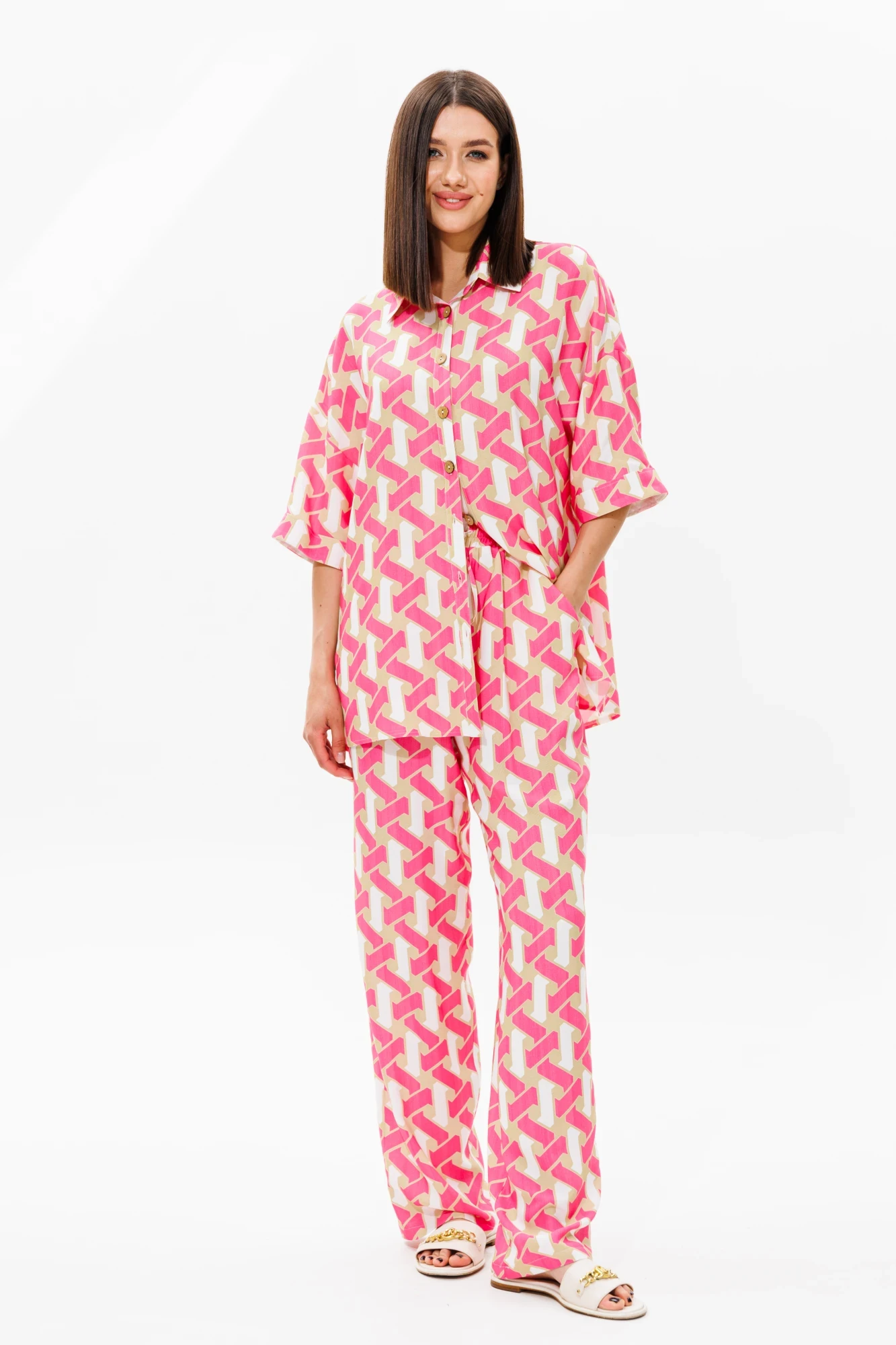 Стильный комплект, состоящий из блузы рубашечного силуэта и свободных брюк.
