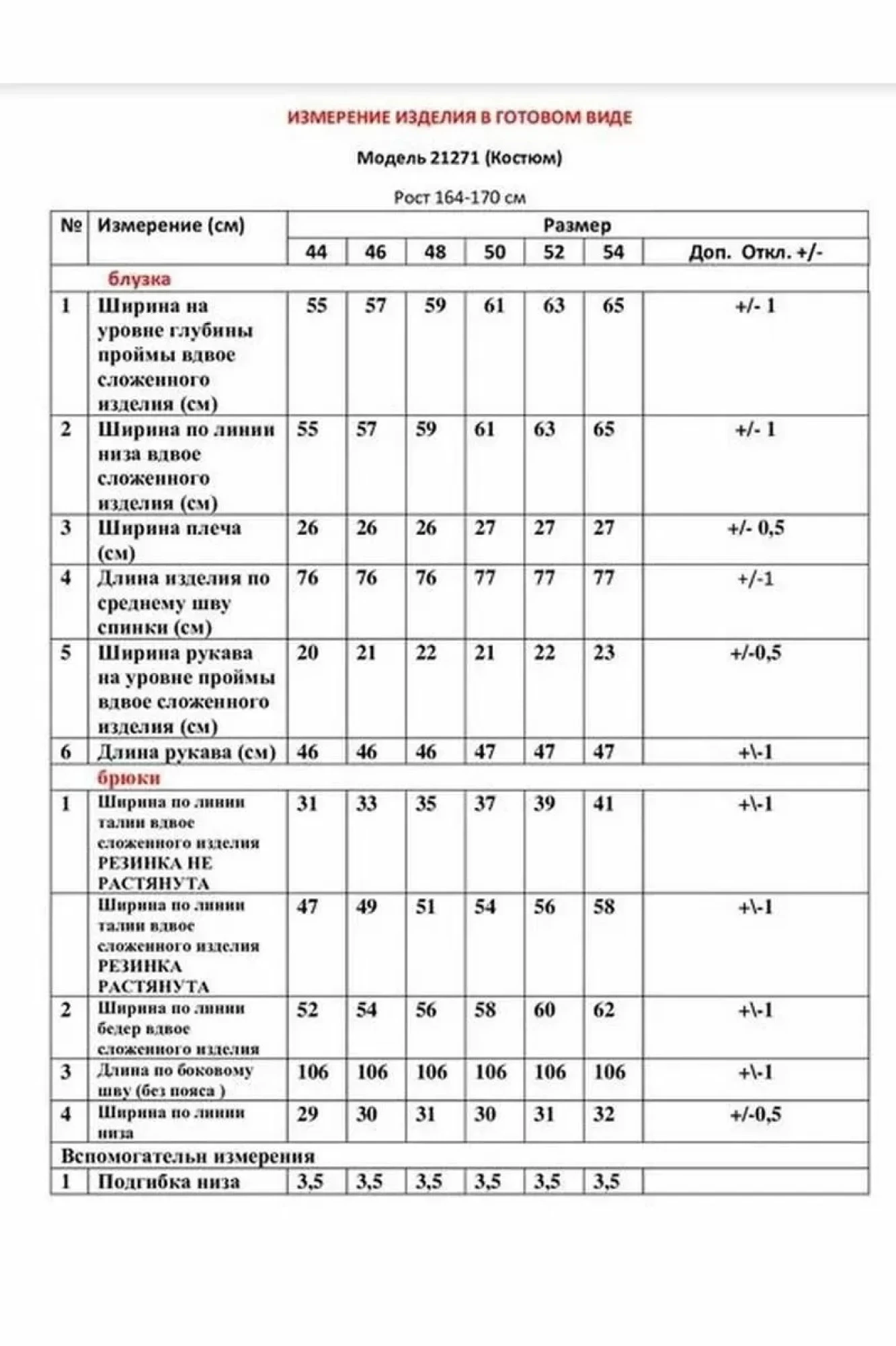 Очень понравилась ткань. Держит форму. Качественно сшит костюм. Блузка смотрится неплохо, но очень большие брюки. В целом смотрится громоздким. Если бы костюм был бы сшит по фигуре, а не размахаем, был бы идеальным на лето. Очень жаль.