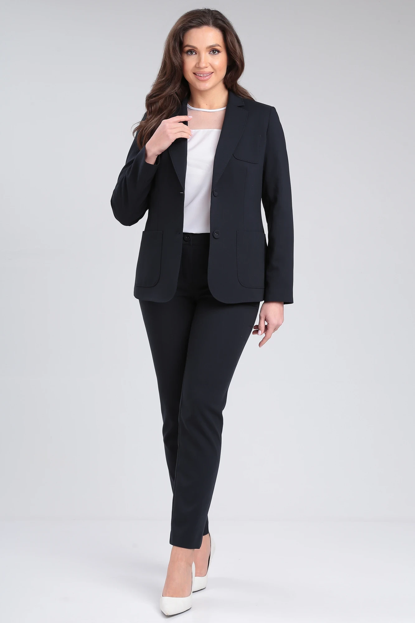 Комплект женский состоящий из жакета ,брюк и блузки. Жакет полуприлегающего силуэта на подкладке удлиненный. Перед с декоративными вытачками, спинка с рельефами. По переду фигурные функциональные накладные карманы. Воротник пиджачного типа, застежка центральная бортовая на петли и пуговицы. Рукав втачной двушовный длинный. Брюки на притачном поясе зауженные к низу, застегивающиеся на петлю и пуговицу. По переду карманы-хулиганы, сзади карманы отсутствуют. Отделкой является отделочная строчка имитация ручного стежка. Блузка женская полуприлегающего силуэта с нагрудными вытачками без рукава. По переду и спинке кокетки из сетки. Пройма и горловина на окантовке.