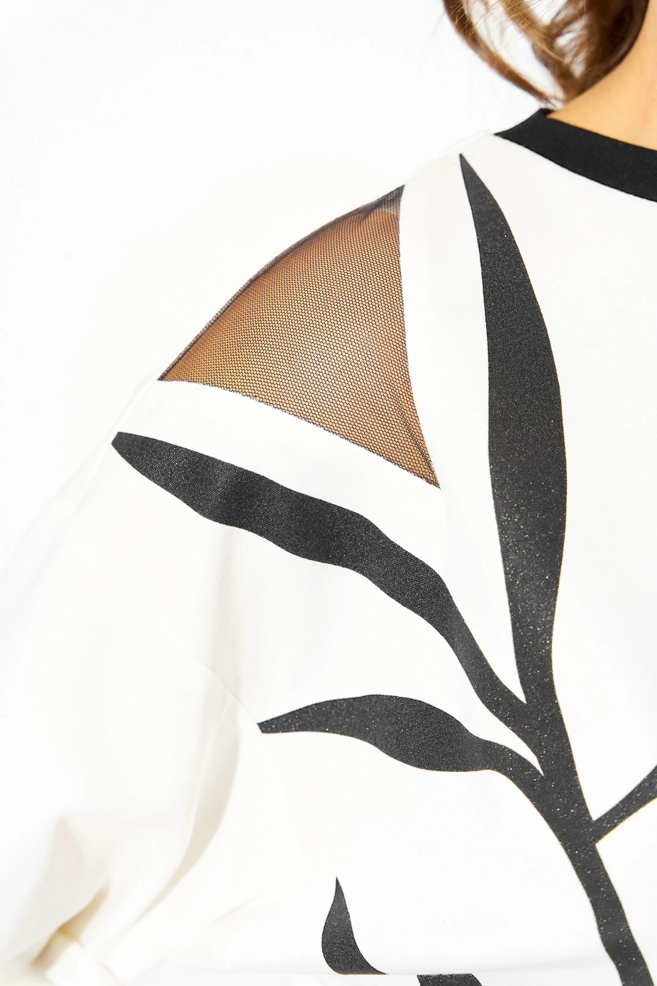 Нарядная блузка-туника больших размеров, выполнена из трикотажного джерси. Модель прямого силуэта, со спущенной линией плеча и рукавом длиной ¾-ти. Модель с округлым вырезом горловины на мягкой притачной планке контрастного цвета. По бокам предусмотрены разрезы на свободу. Полочка декорирована печатью накатом с мерцающим эффектом в виде ветви. На плече ассиметричная вставка из сетки. Брюки в комплекте прямого фасона, средней посадки. Пояс притачной, в боковых участках вставлена резинка. Застежка – брючная тесьма-молния с обработанным гульфиком. По переду заутюжены канты. Брюки с боковыми карманами.