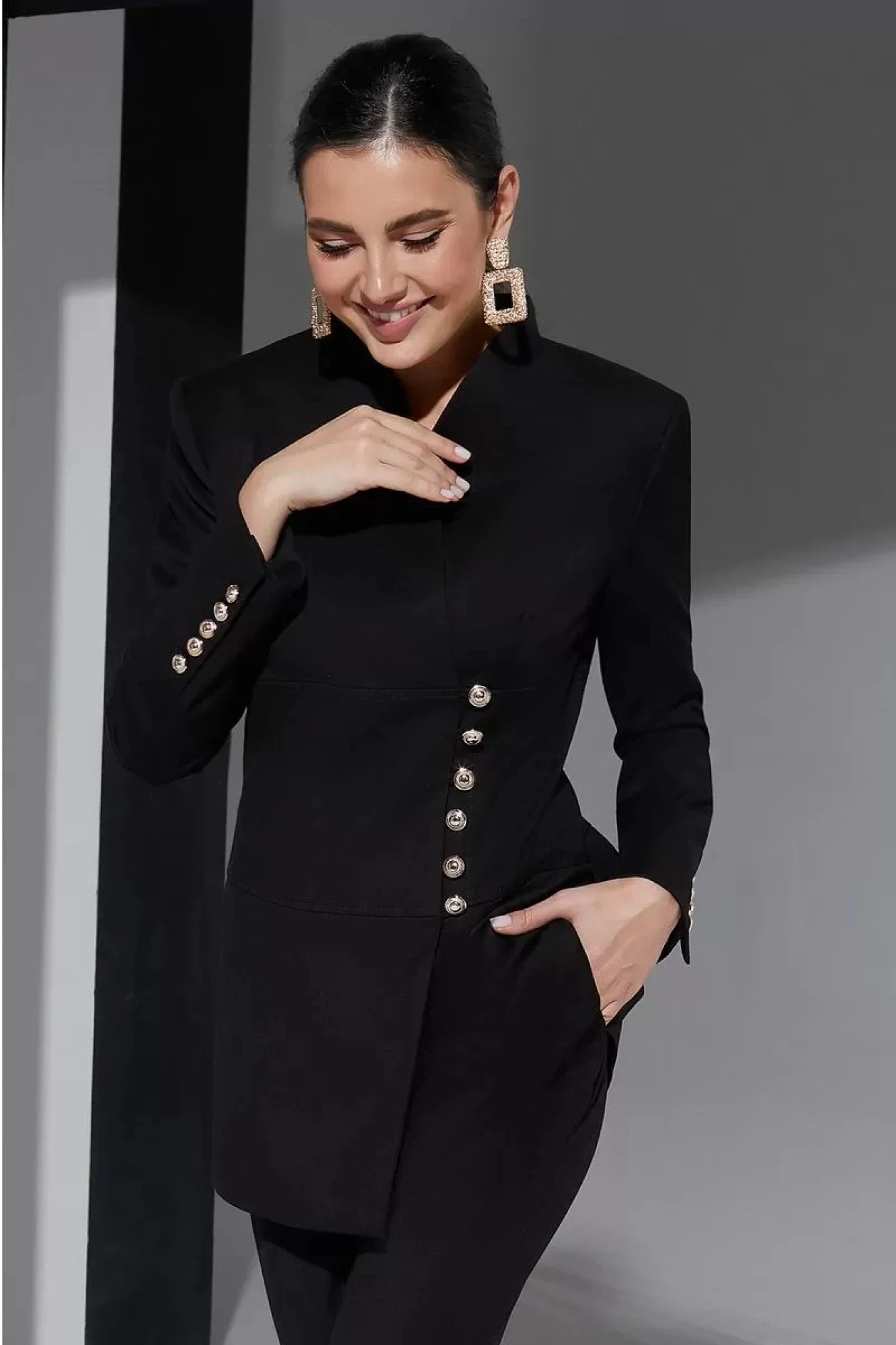 Дизайнерский брючный костюм со смещенной застежкой отличный выбор для ценителей минимализма и строгого стиля. Универсальный комплект впишется в любой гардероб и подойдет на все случаи жизни, подходит для шпилек и обуви на плоском ходу. Вещи из этой ми капсулы легко сочетать с другими вещами, базовые черные брюки отлично будут смотреться с белой рубашкой, а удлиненный жакет можно носить как легкий плащ с платьем или юбкой. Удлиненный жакет с цельнокроеной стойкой и смещенной застежкой, застегивается на воздушные навесные петли. Перед и спинка с подрезами ниже груди и талии оформлены декоративными отстрочками. Рукав втачной с отлетной шлицей. Базовые брюки с косыми карманами заужены к низу. Застежка обработана по классической технологии (гульфик с молнией и пуговица на поясе). Вся обработка выполнена как в классических итальянских костюмах. Жакет на подкладке. На обтачке спинки жакета выполнена аккуратная вышивка.