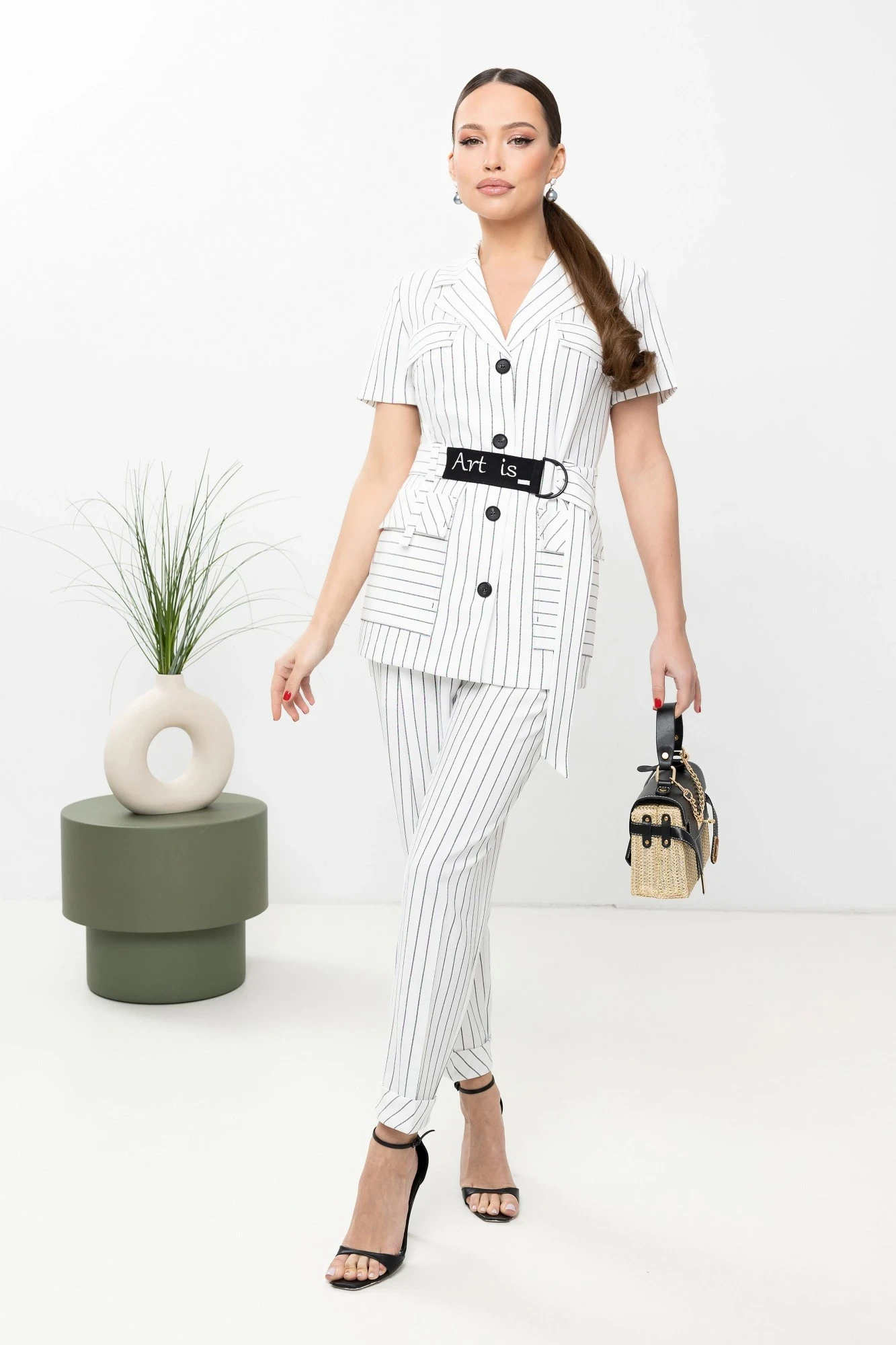 Жакет со стояче-отложным воротником пиджачного типа и центральной застёжкой на петли и пуговицы. На уровне талии съёмный пояс с дизайнерской вышивкой. Перед с клапанами в верхней части и карманами в нижней. Спинка с талиевыми вытачками и шлицей в среднем шве. Рукава втачные.