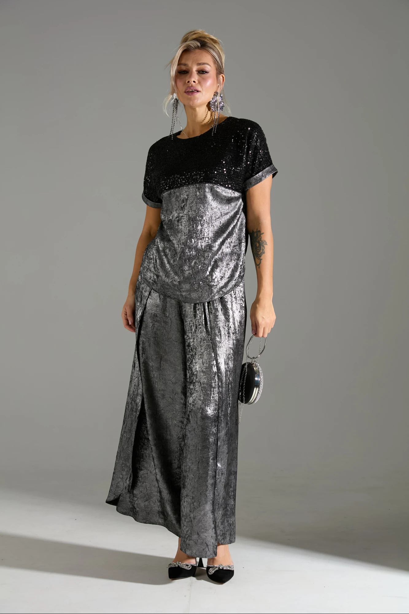 Блузка свободного объёма с короткими цельнокроеными рукавами с подворотами. Вырез горловины круглый. По переду подрез ниже линии груди. Верх блузки по переду выполнен из ткани расшитой пайетками.