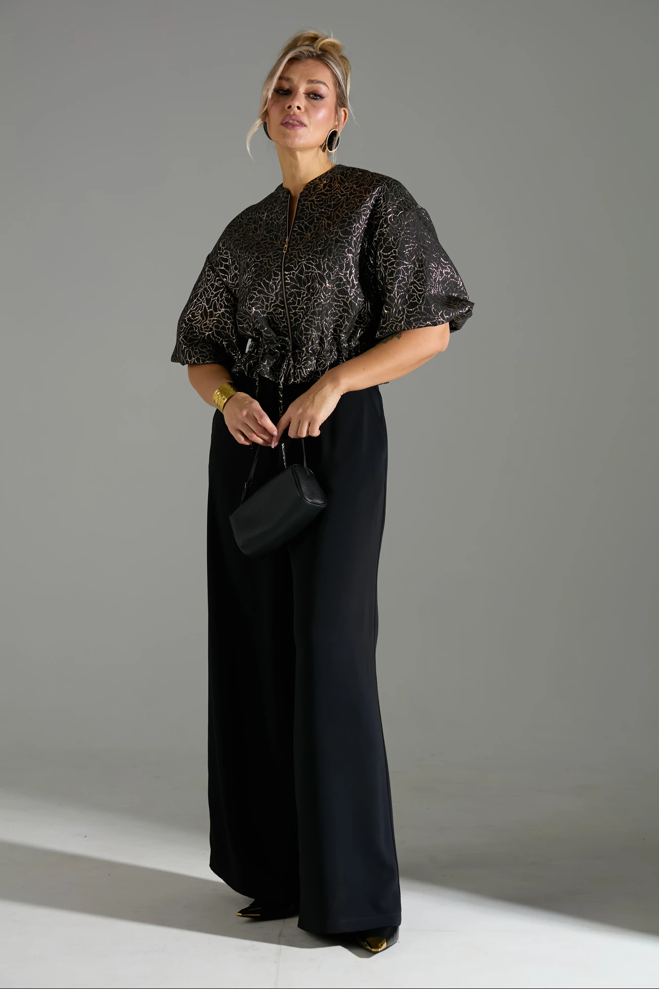 Комплект 2-ка, состоящий из жакета и брюк. Жакет с застёжкой на молнию и объёмными рукавами. Линия талии на кулисе и завязке из основной ткани. Брюки широкого объема, прямого силуэта. В боковых швах расположены карманы. Застежка-гульфик. Пояс отрезной, притачной. В задней части пояса вставлена эластичная тесьма (резинка). Пояс застегивается на петлю и крючок.