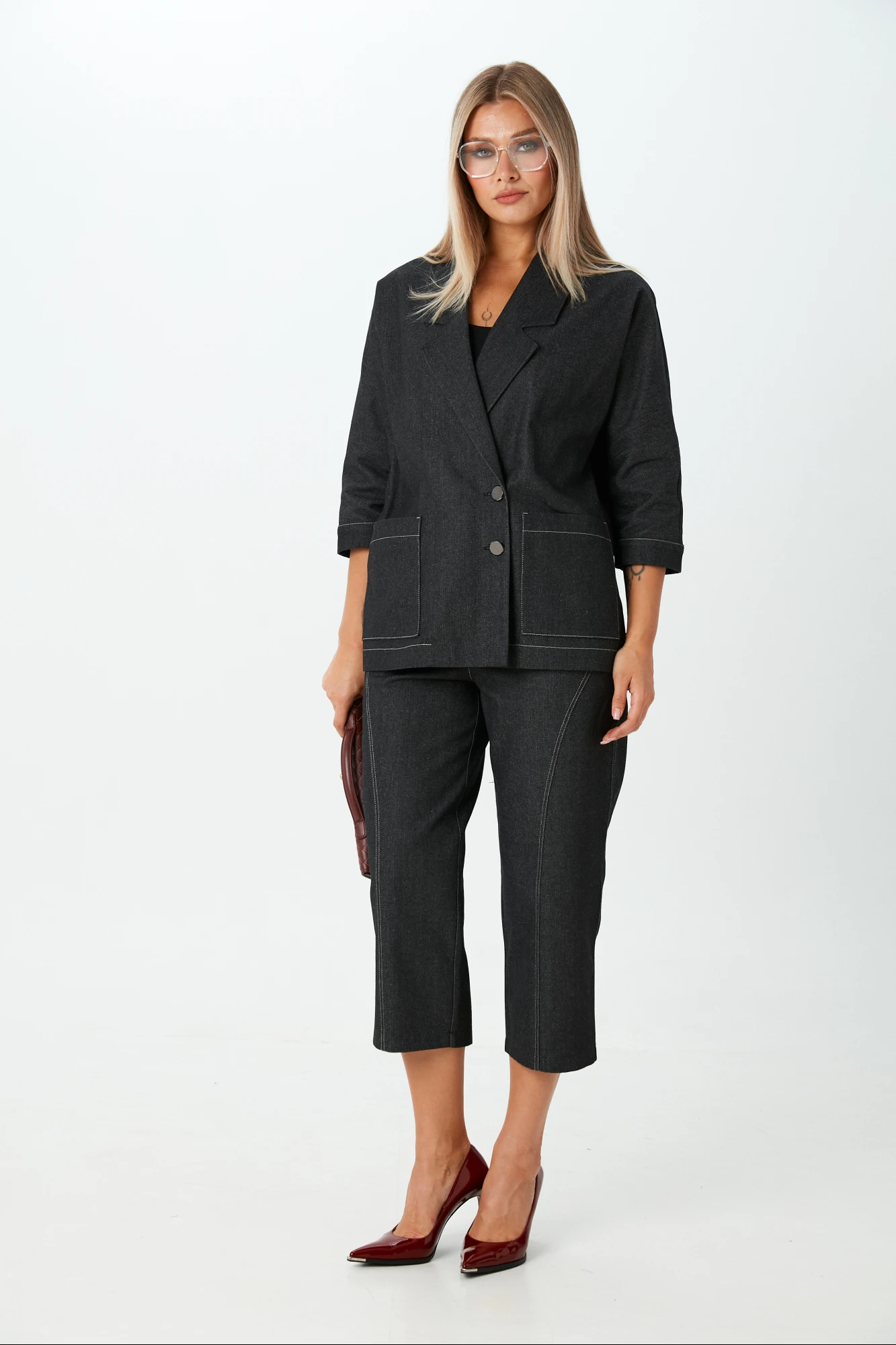 Комплект 2ка, состоящий из жакета и брюк. Жакет большого объёма с двубортной застежкой по одной стороне на петли и пуговицы. Рукава 3/4 с манжетами. Жакет без подкладки. По переду расположены накладные карманы. Длина жакета по спинке 70-72 см. Брюки капри, зауженные и укороченные к низу, выполнены из джинсовой ткани. По переду и сзади расположены карманы. Застежка на пуговицу и молнию.