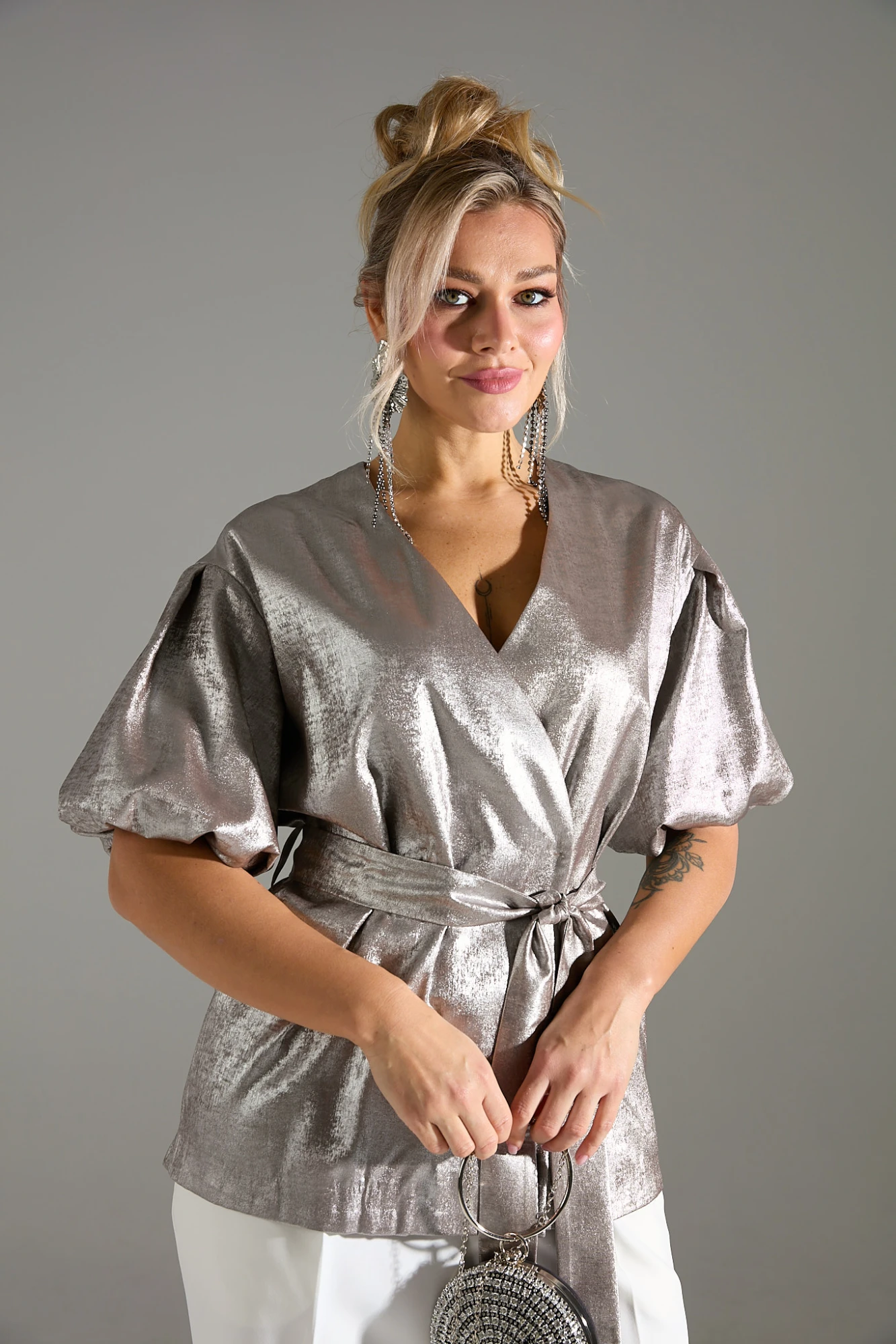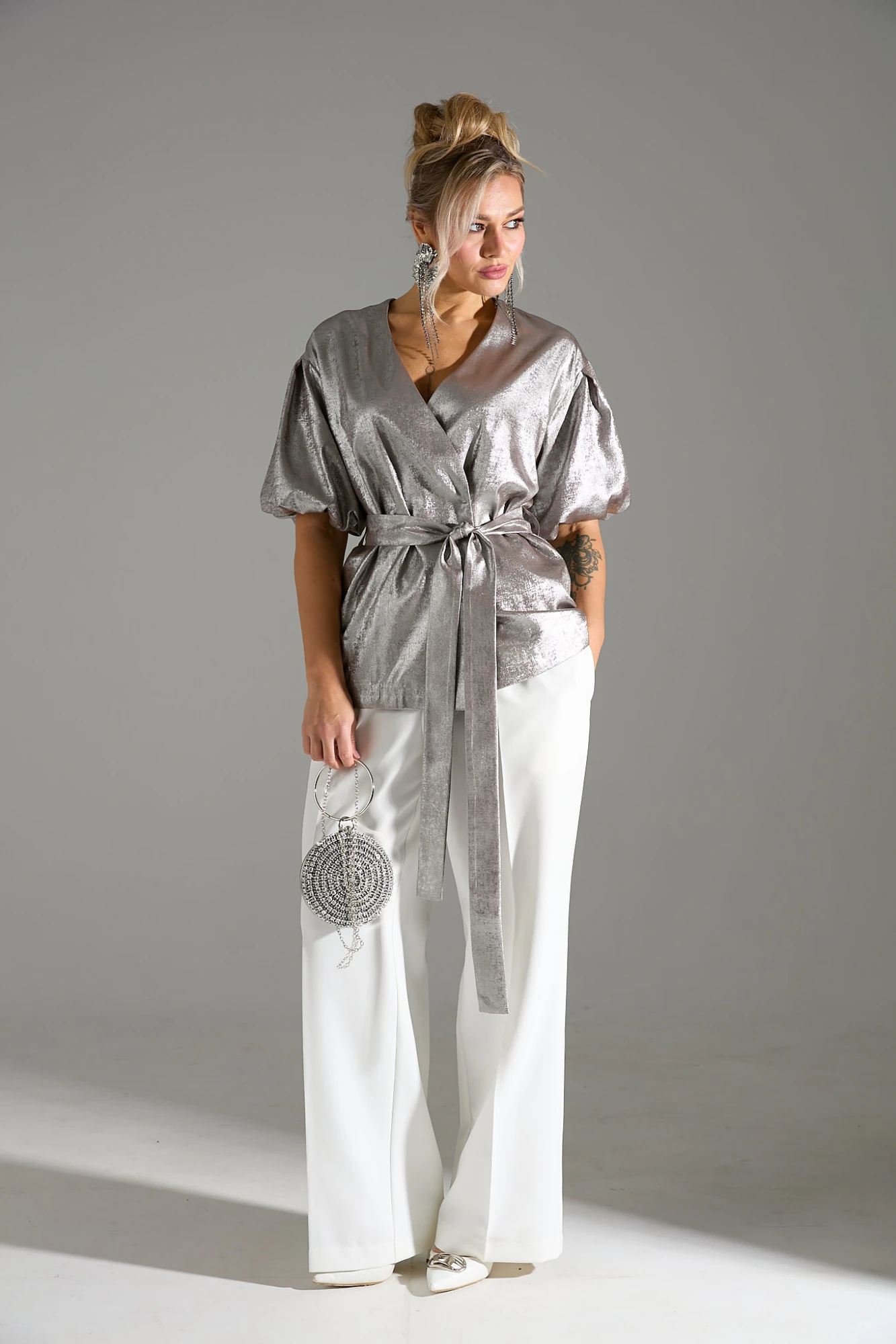 "Комплект 2ка, состоящий из жакета и брюк. Легкий жакет на подкладке с объёмными рукавами. Перед на запах с застежкой на кнопки, под пояс по талии.