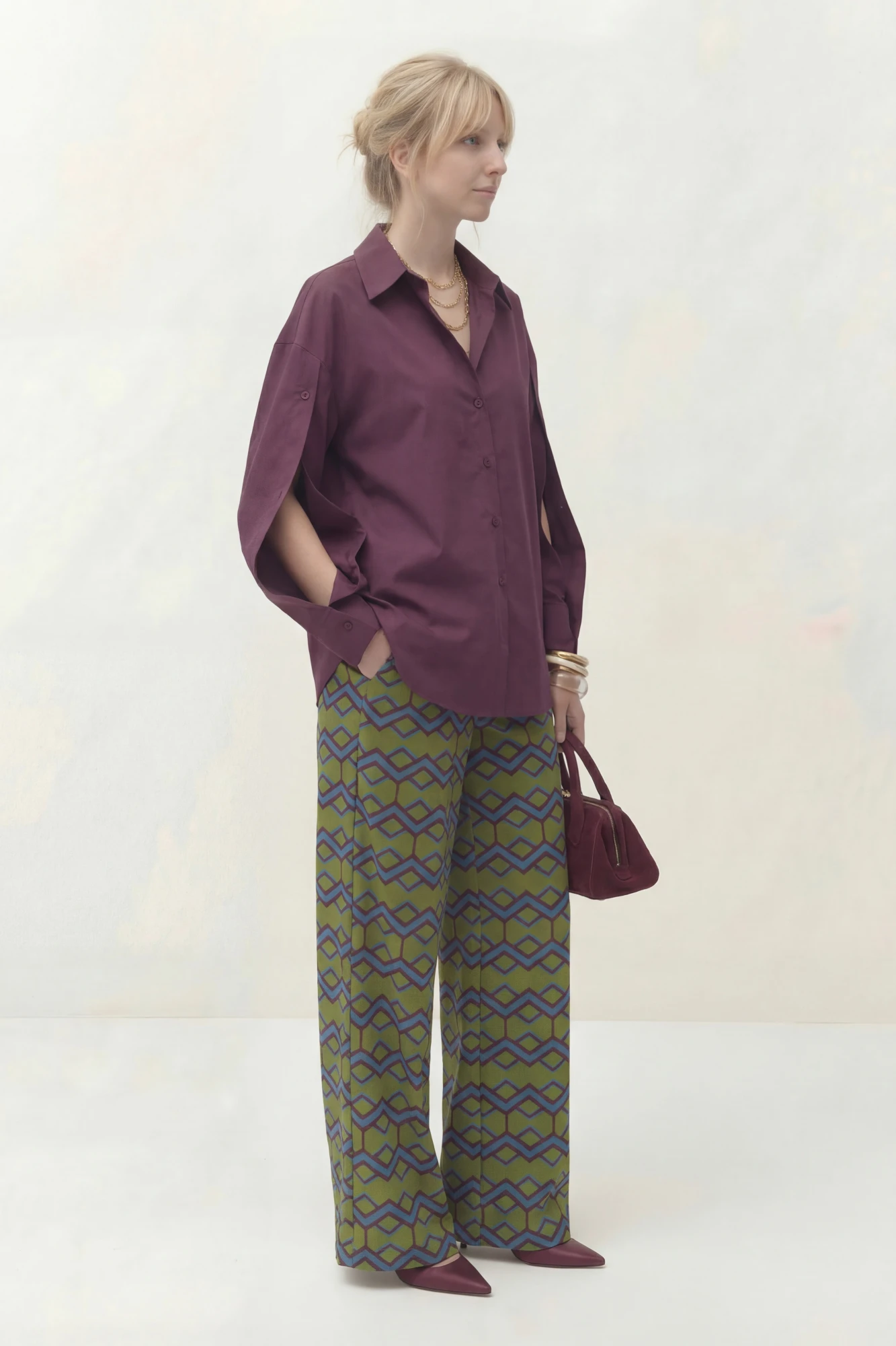 Блуза выполнена из хлопка свободного кроя. Рукав втачной длинный, по переднему шву рукава застежка на петли и пуговицы, по низу рукава манжета. По горловине воротник рубашечного типа на стойке. По переду планка с застежкой на петли и пуговицы. Брюки из нежной вискозной ткани свободного кроя, прямого силуэта, по талии на резинке, в боковых швах карманы.