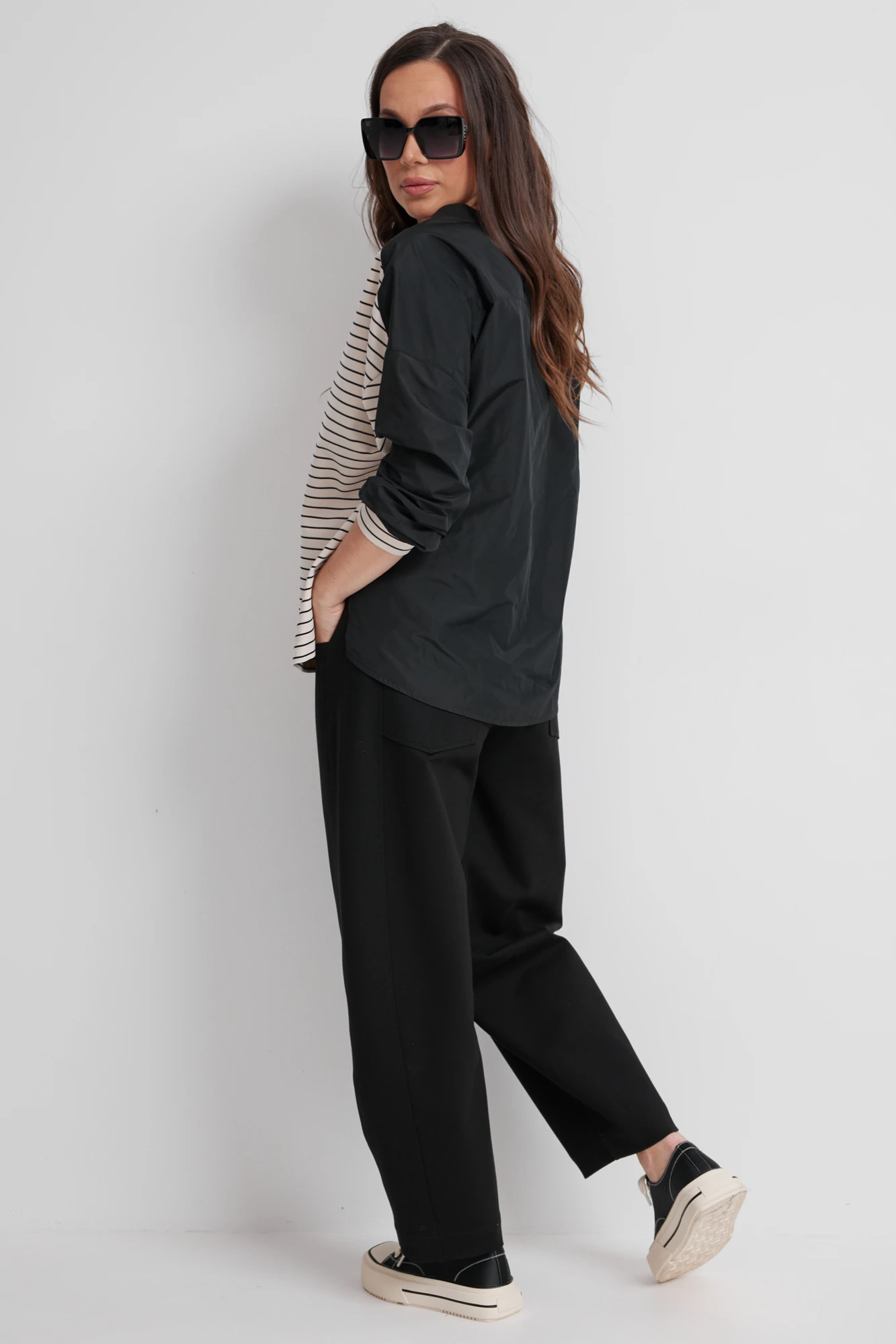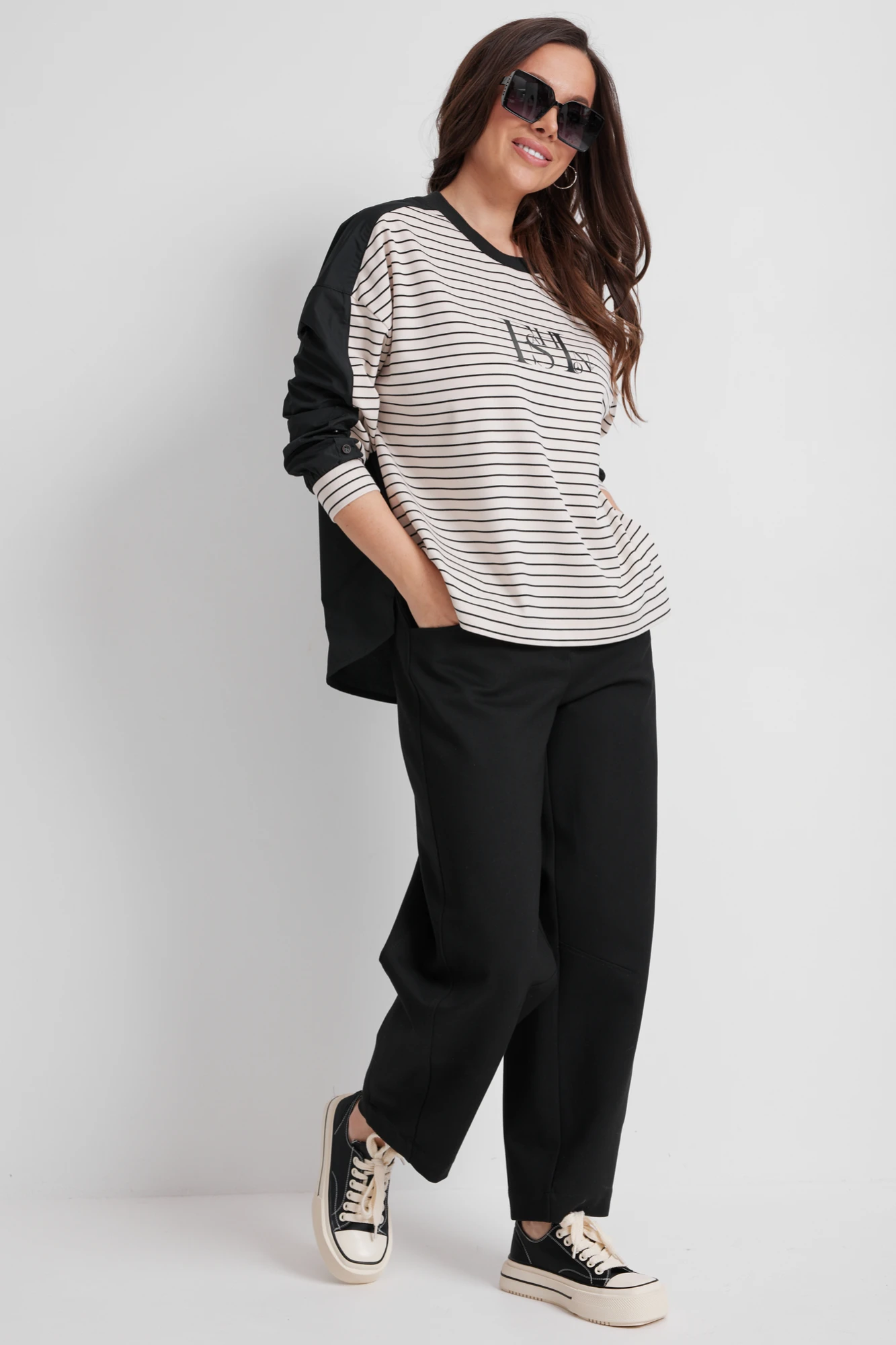 Стильный комплект из джемпера и брюк. Джемпер свободного кроя. Перед выполнен из гладкого трикотажного полотна в полоску. Спинка выполнена из плотной рубашечной ткани. Рукав втачной, слегка спущен. Дополнен притачными манжетами. Горловина округлой формы. По спинке джемпер длиннее. Удобные и очень практичные брюки свободного кроя, слегка заужены к низу, с притачным поясом, дополненным эластичной тесьмой и шлевками для пояса. Посадка средняя. Застежка гульфик на молнию и пуговицу. Выполнены из плотного трикотажного полотна. Брюки дополнены удобными боковыми и накладными задними карманми. Длина джемпера от плечевого шва по переду 65см, по спинке 72см. Длина рукава 60см. Длина брюк по боковому шву 98см.