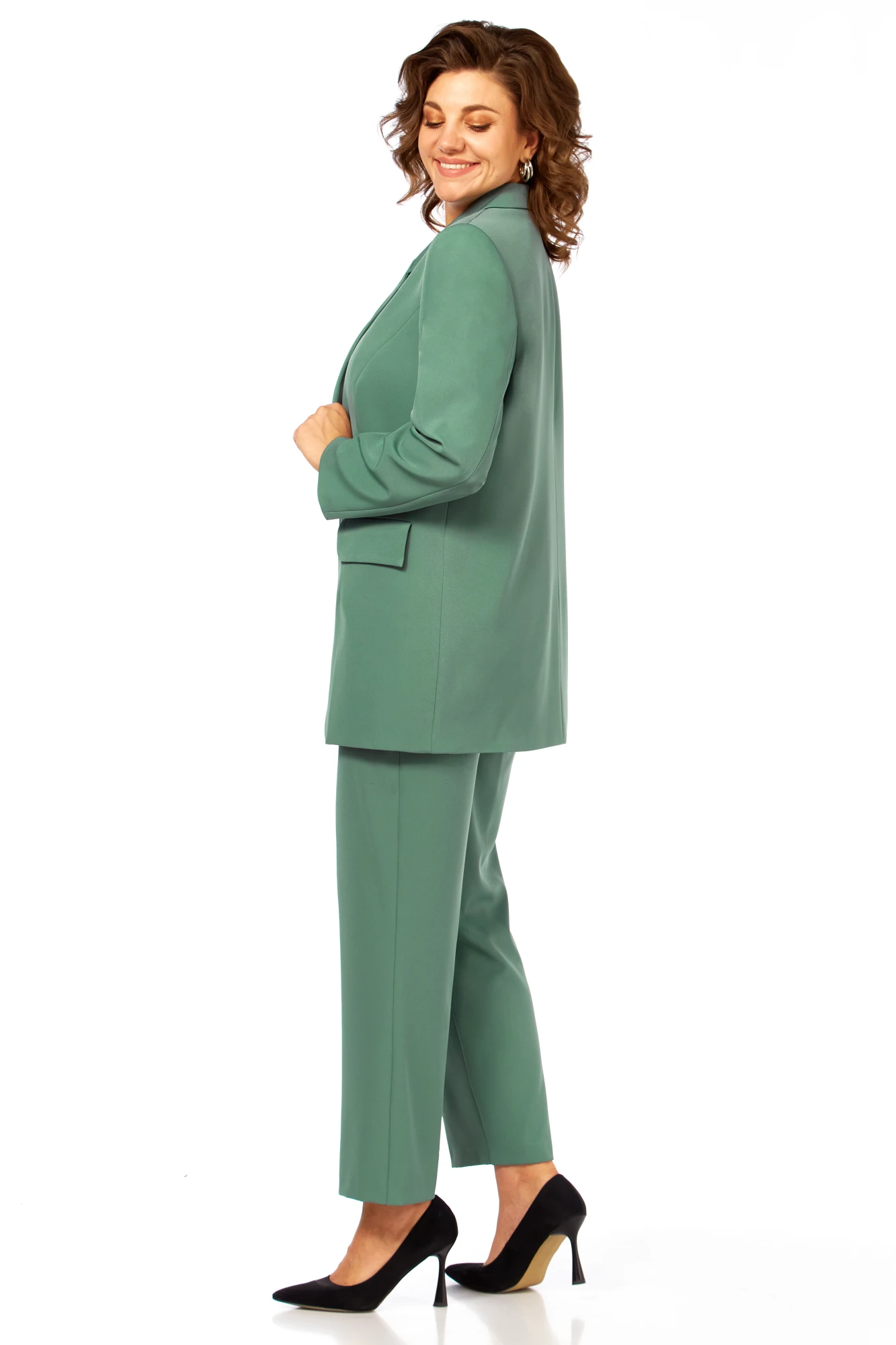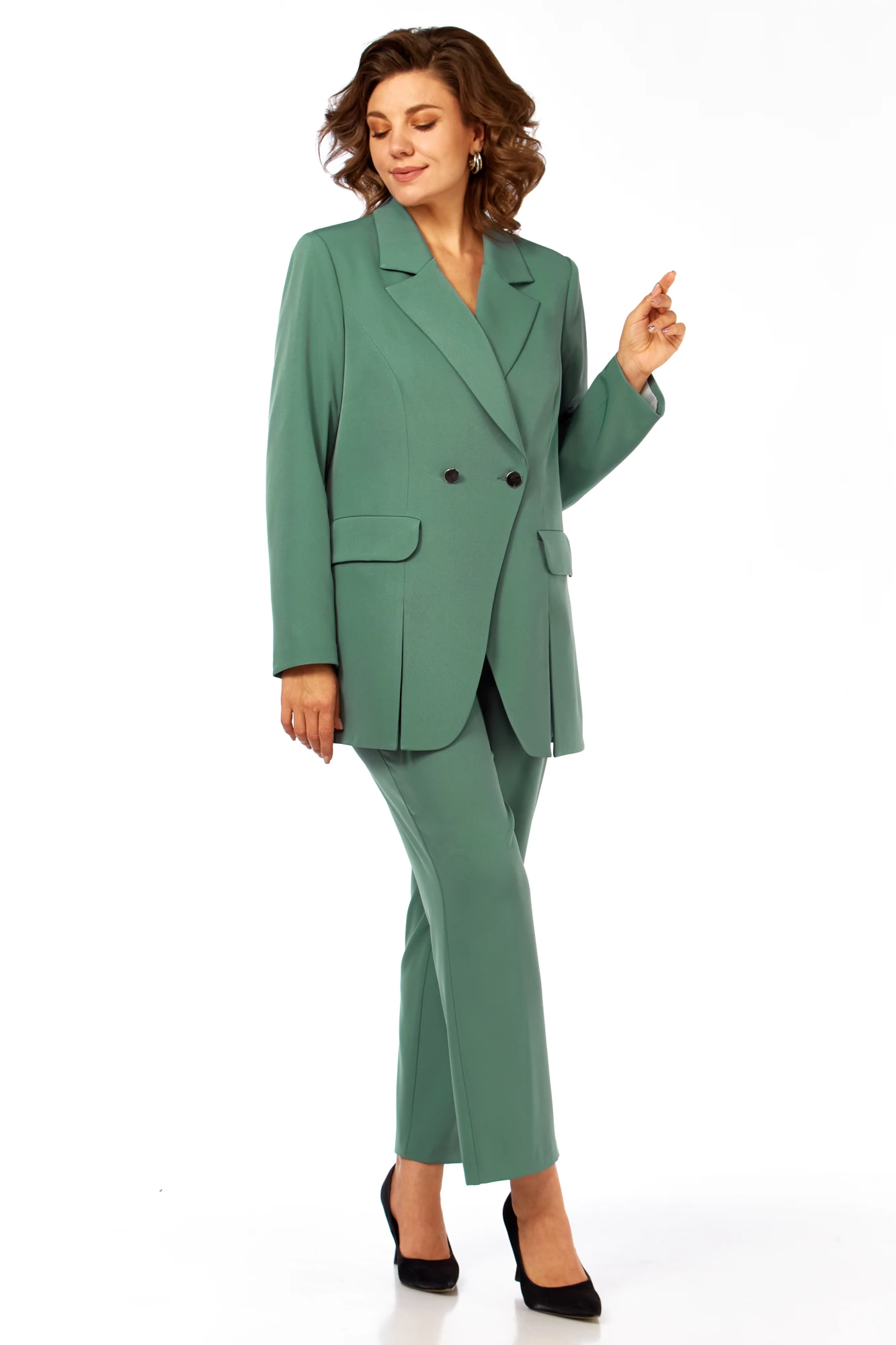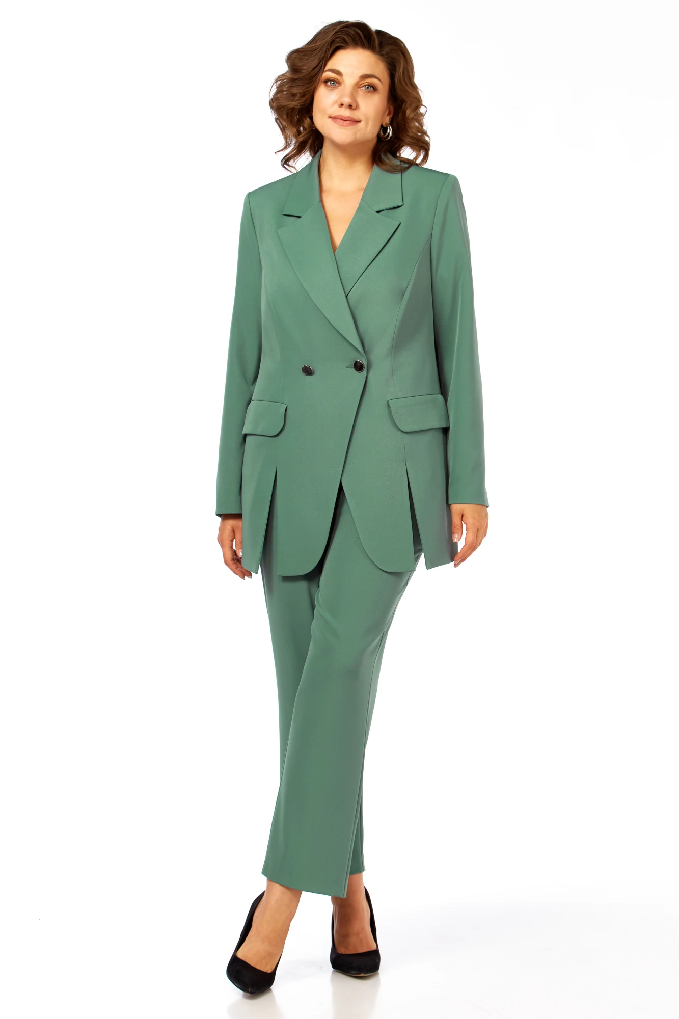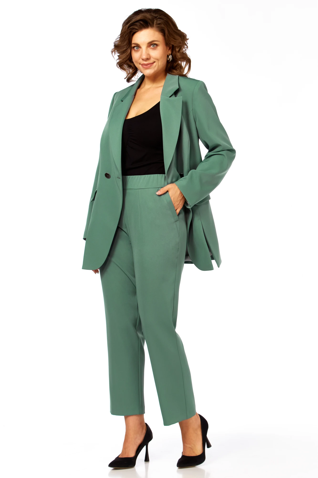 Комплект женский 2-х предм., состоящий из жакета и брюк. Жакет женский прямого силуэта, с плечевыми накладками на притачной подкладке. По переду выполнены рельефы переходящие в разрезы. На уровне линии талии выполнены прорезные карманы с листочкой и клапаном. По центру переда ассиметричная двухбортная застежка на петли пуговицы. Рукав втачной, двухшовный, длинный. Воротник пиджачного типа. Брюки слегка заужены к низу, на круговой резинке по поясу, с вытачками по переду, и карманами-хулиганами, с листочкой с настрочными концами, в боковых швах