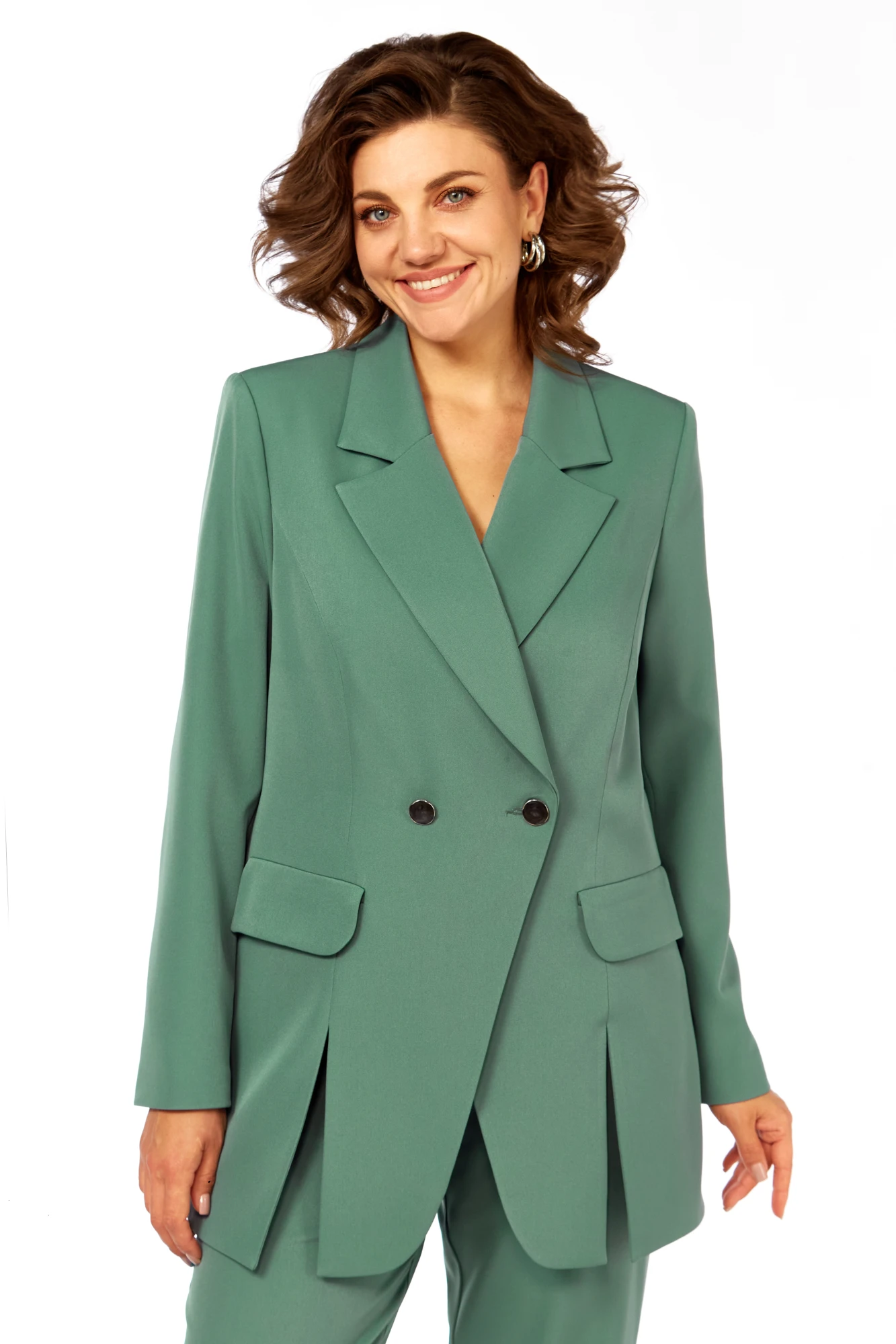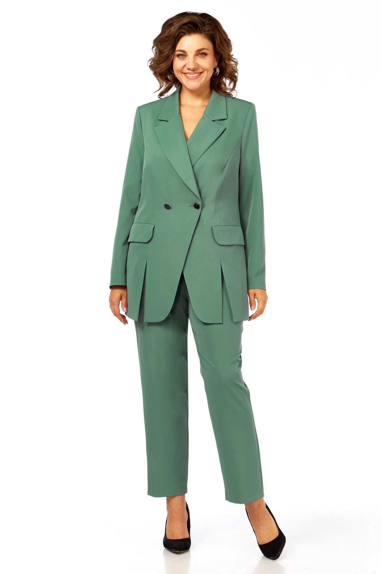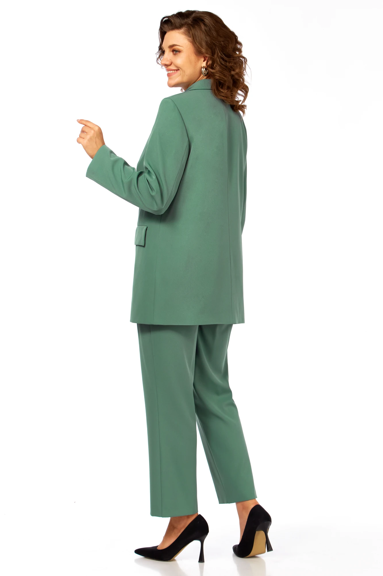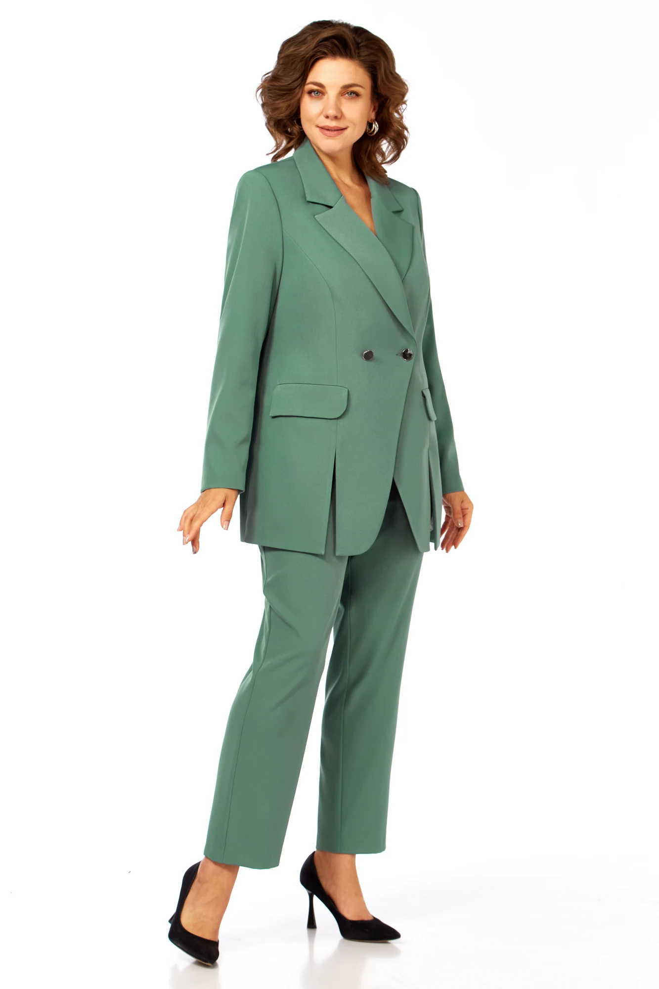 Комплект женский 2-х предм., состоящий из жакета и брюк. Жакет женский прямого силуэта, с плечевыми накладками на притачной подкладке. По переду выполнены рельефы переходящие в разрезы. На уровне линии талии выполнены прорезные карманы с листочкой и клапаном. По центру переда ассиметричная двухбортная застежка на петли пуговицы. Рукав втачной, двухшовный, длинный. Воротник пиджачного типа. Брюки слегка заужены к низу, на круговой резинке по поясу, с вытачками по переду, и карманами-хулиганами, с листочкой с настрочными концами, в боковых швах