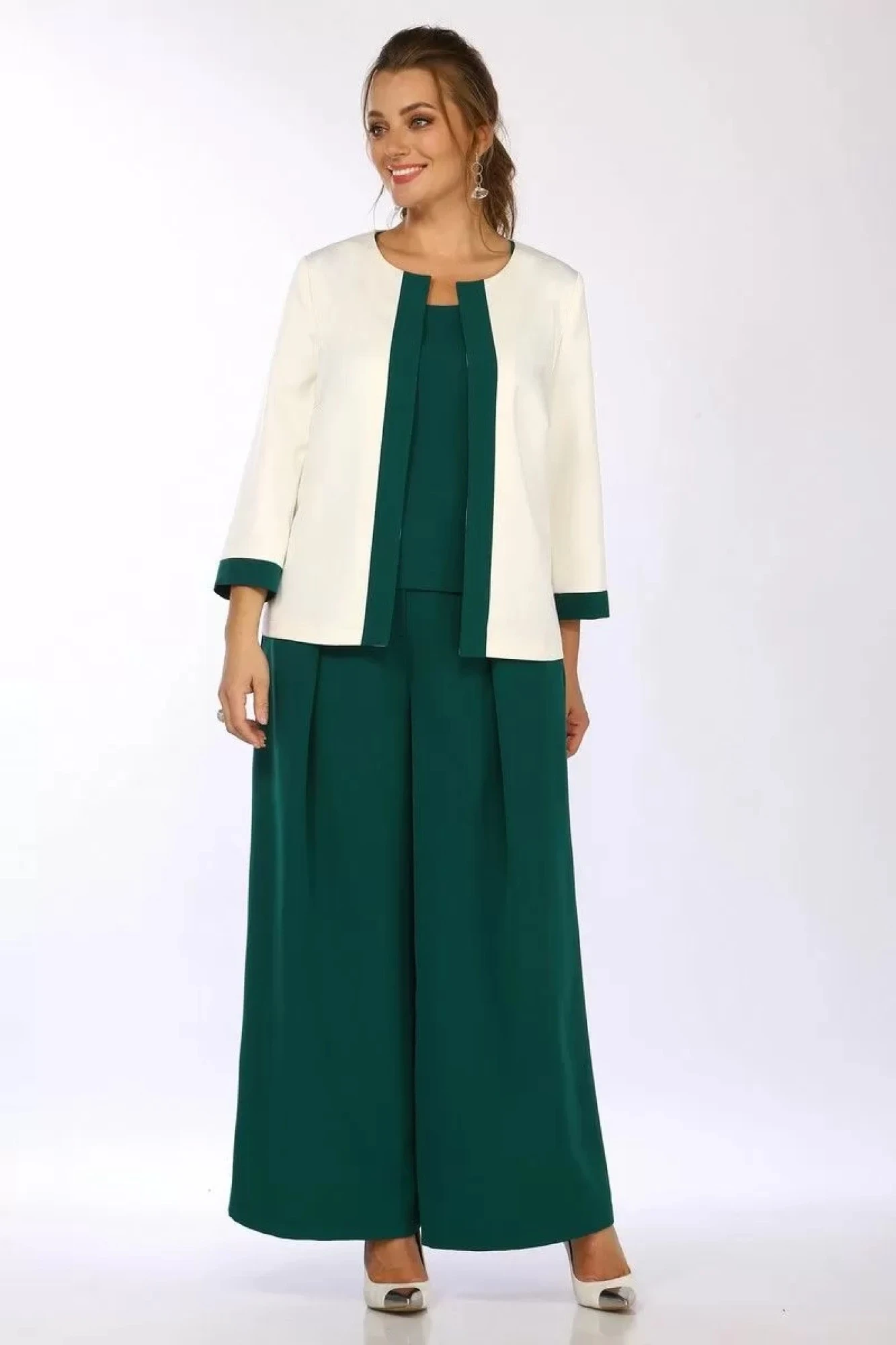 Комплект женский 3-х предметный, состоящий из брюк-палаццо, жакета и блузки. Блузка прилегающего силуэта, на широких бретелях, с квадратным вырезом горловины, с рельефами от углов горловины и до низа изделия. потайная тесьма-молния в боковом шве. Спинка с талиевыми вытачками. Пройма окантована. Брюки-палаццо, с карманами в боковых швах, с застежкой-молнией и 2 пуговицами. В пояс брюк частично вставлена резинка. Брюки со складками по переду Жакет без застежки, с отрезной планкой. Перед с вытачками из боковых швов. Спинка со средним швом. Рукав втачной, двухшовный, длиной 3/4, с отрезной манжетой.