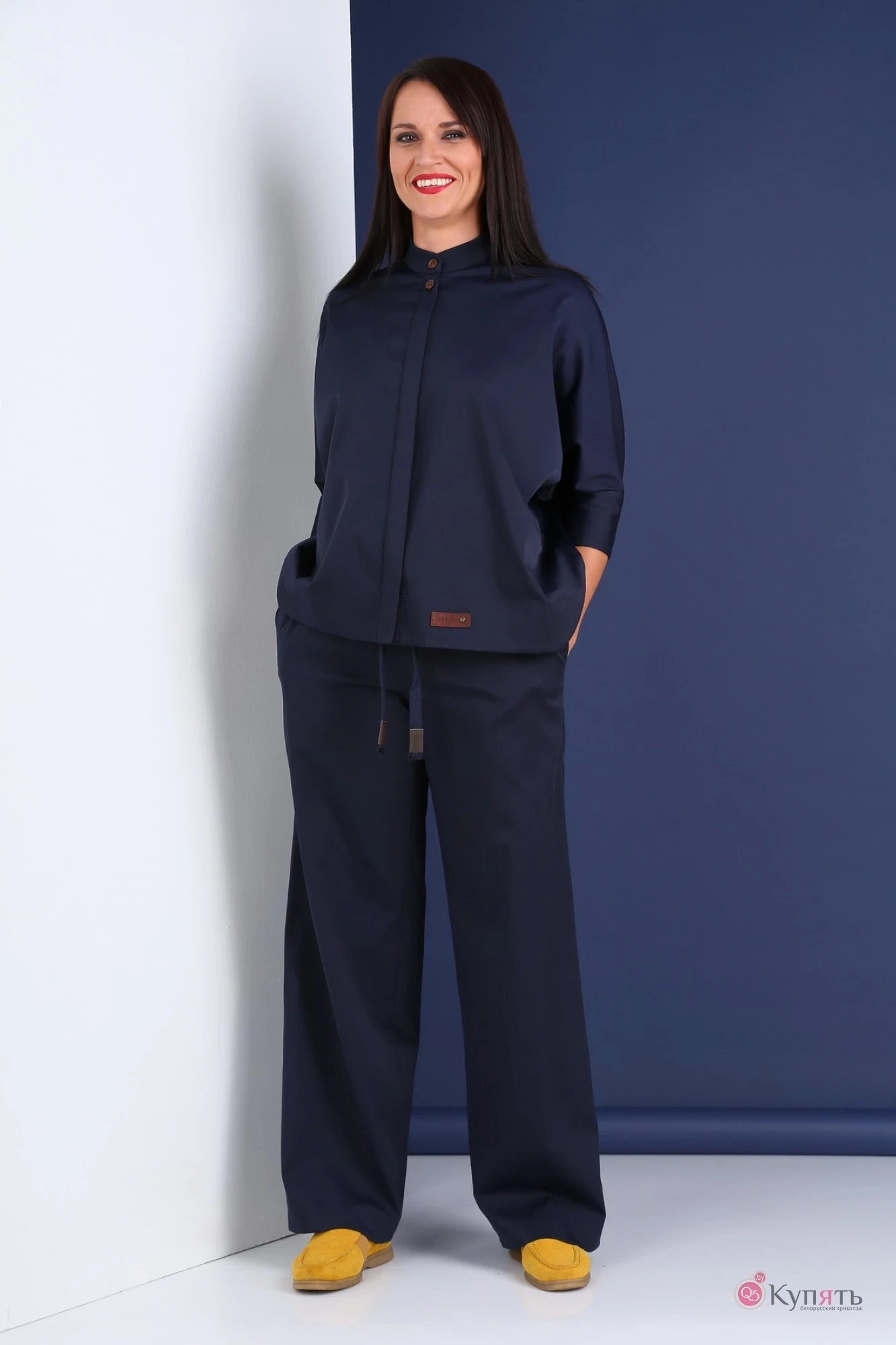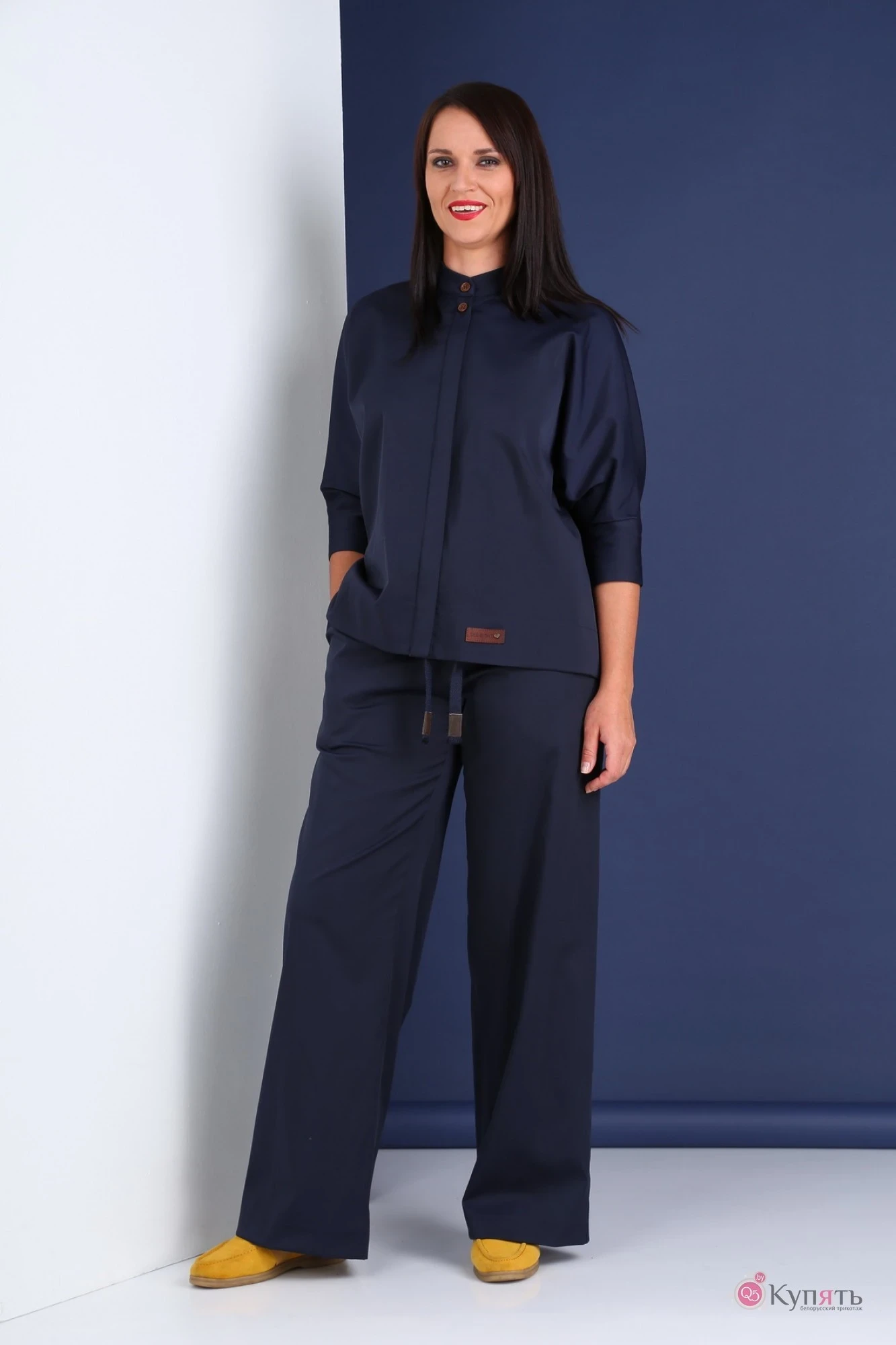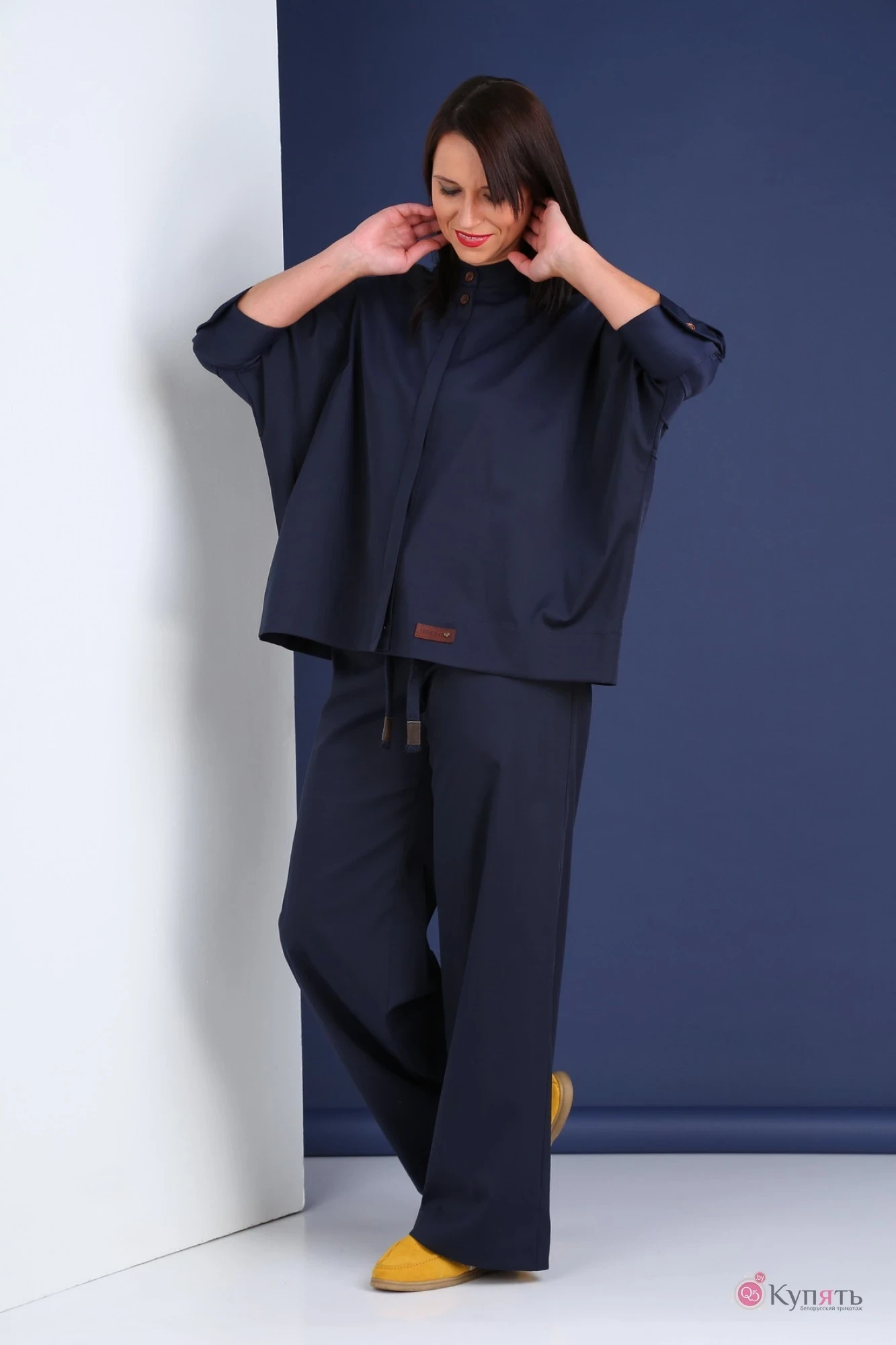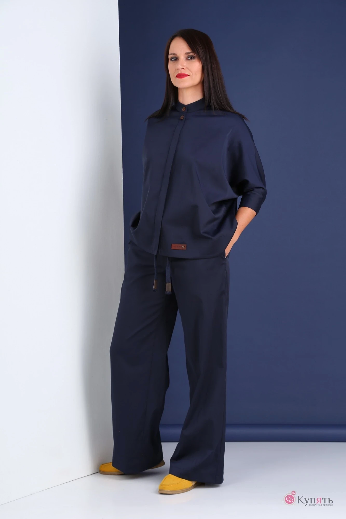 Костюм женский двухпредметный, состоящий из блузы и брюк. Блуза свободного кроя с цельнокроенным рукавом. Полочка с центральной бортовой потайной застежкой на петли-пуговицы. Спинка с поперечной вставкой, декорированой складкой. По низу рукава притачная манжета. Воротник стойка. Брюки прямого силуэта с карманами в отрезных бочках. Притачной пояс с эластичной тесьмой. Дополнительная регулировка обхвата талии с помощью шнура