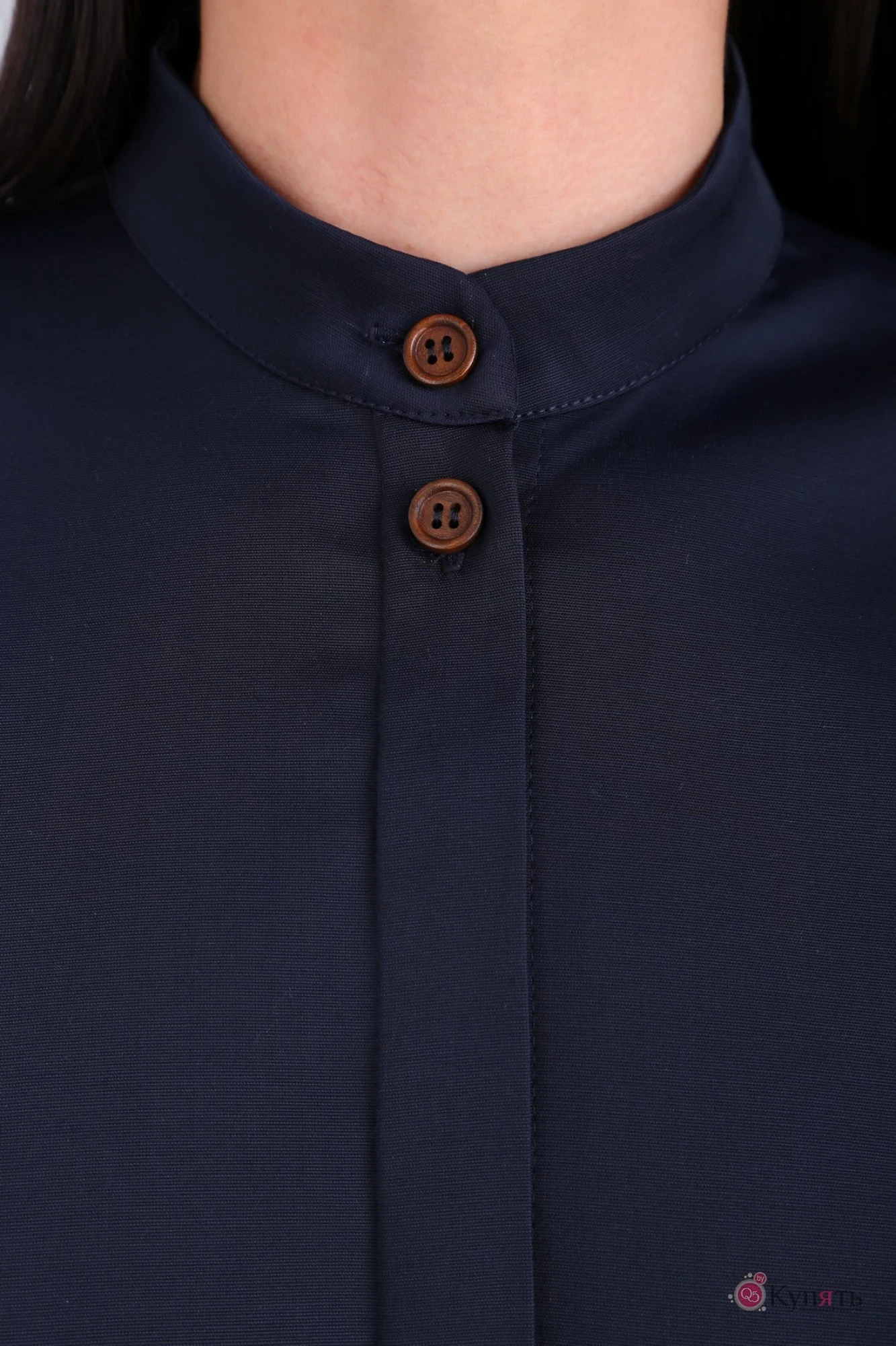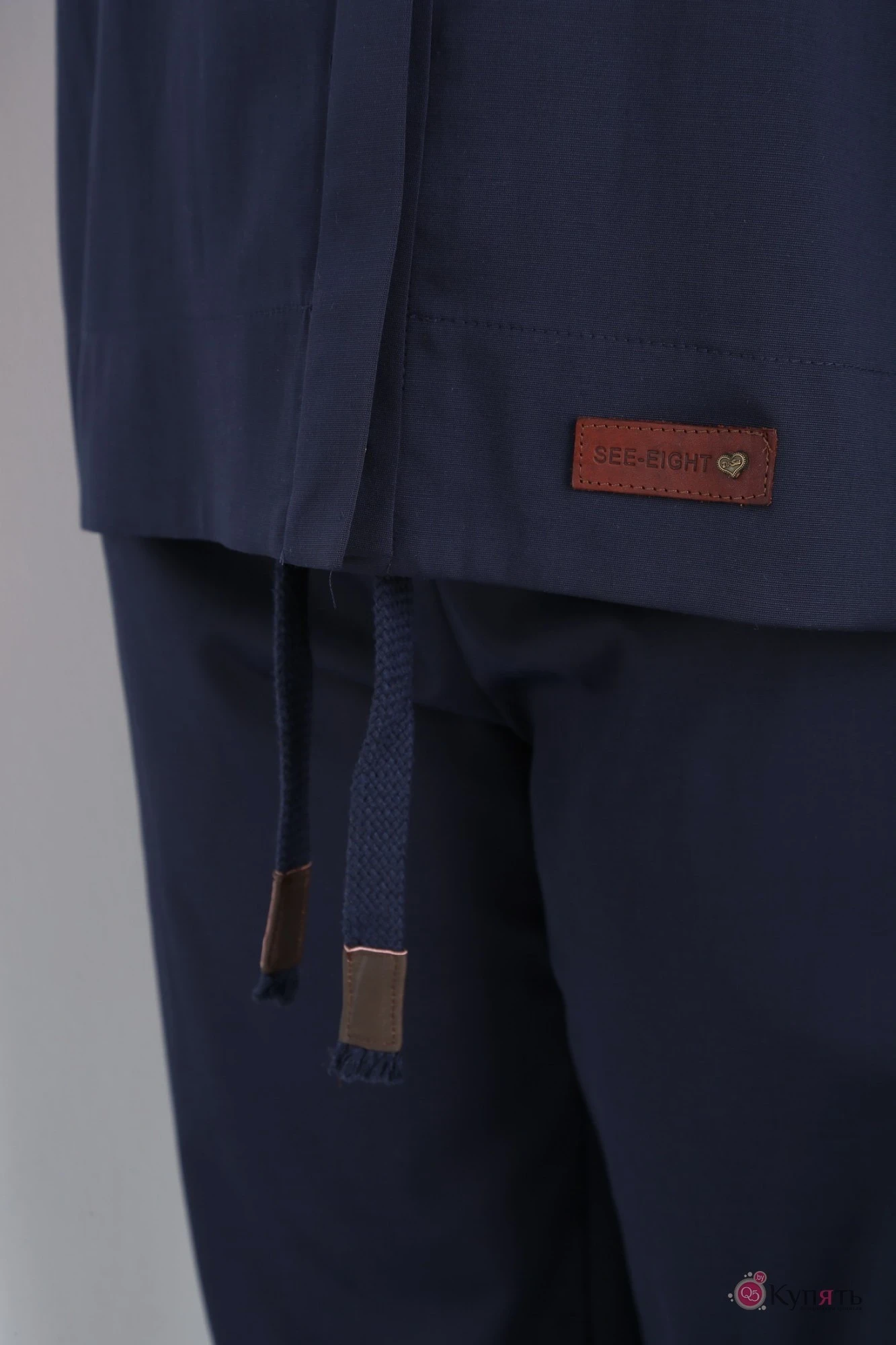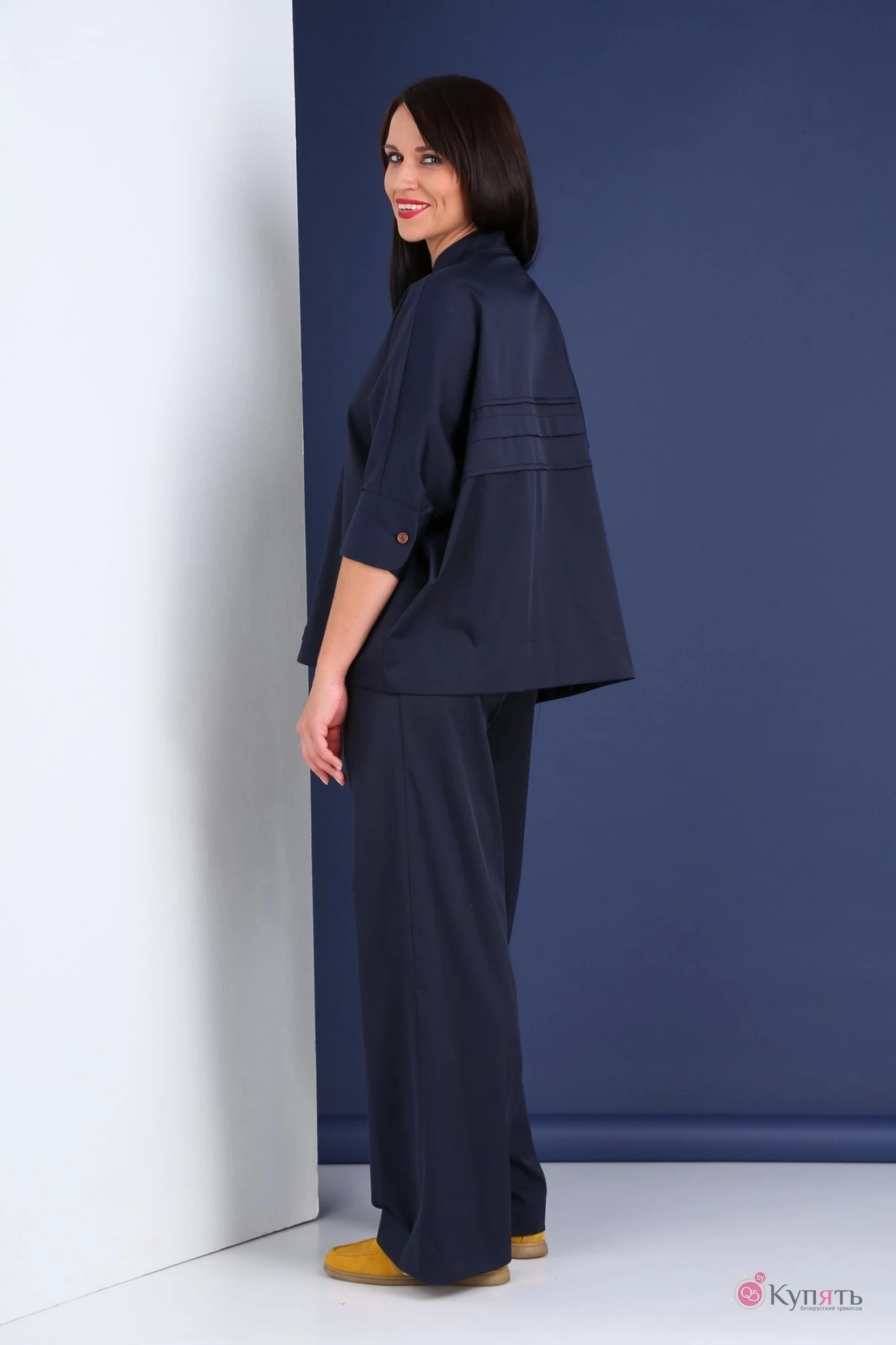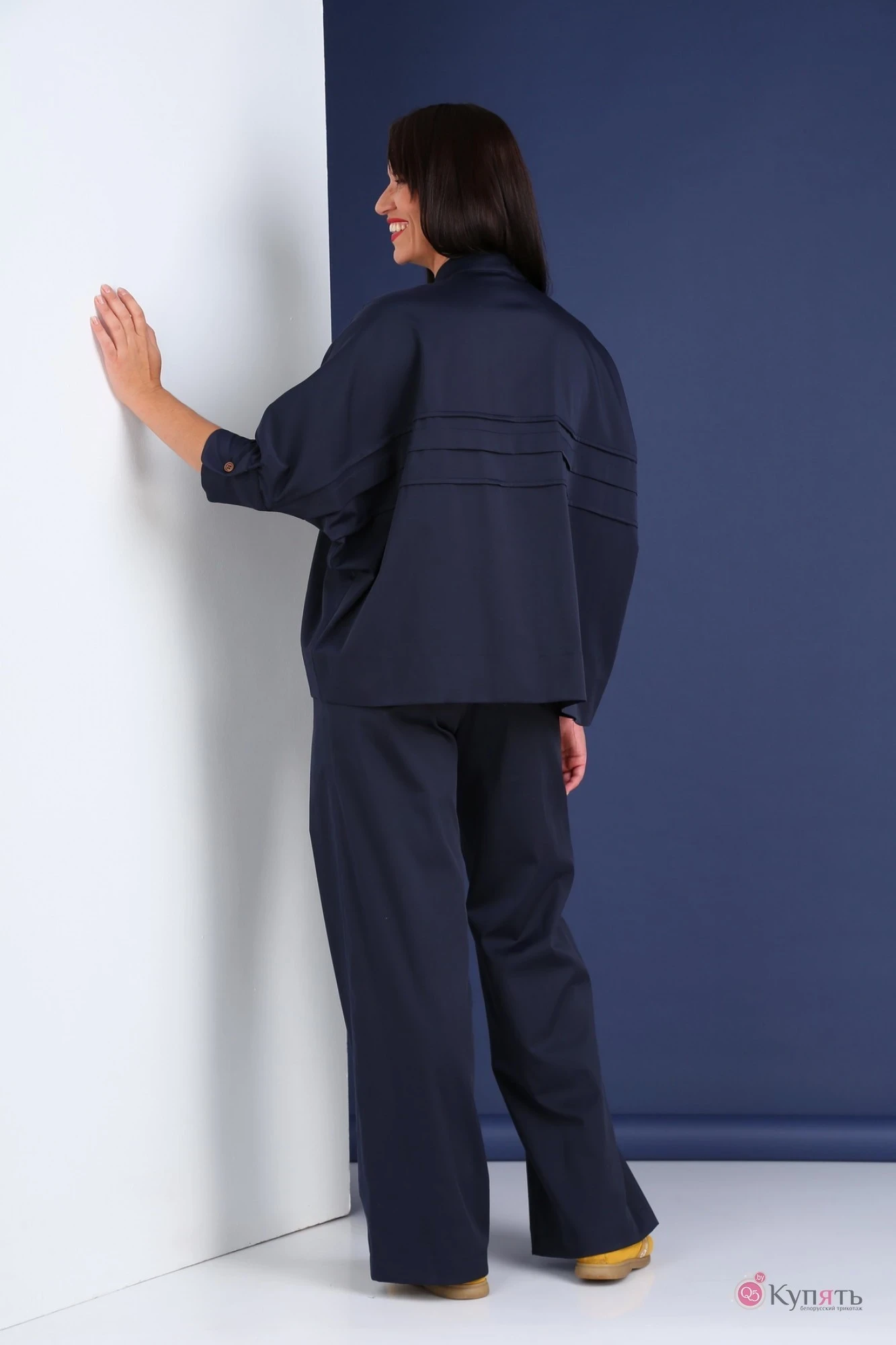 Костюм женский двухпредметный, состоящий из блузы и брюк. Блуза свободного кроя с цельнокроенным рукавом. Полочка с центральной бортовой потайной застежкой на петли-пуговицы. Спинка с поперечной вставкой, декорированой складкой. По низу рукава притачная манжета. Воротник стойка. Брюки прямого силуэта с карманами в отрезных бочках. Притачной пояс с эластичной тесьмой. Дополнительная регулировка обхвата талии с помощью шнура
