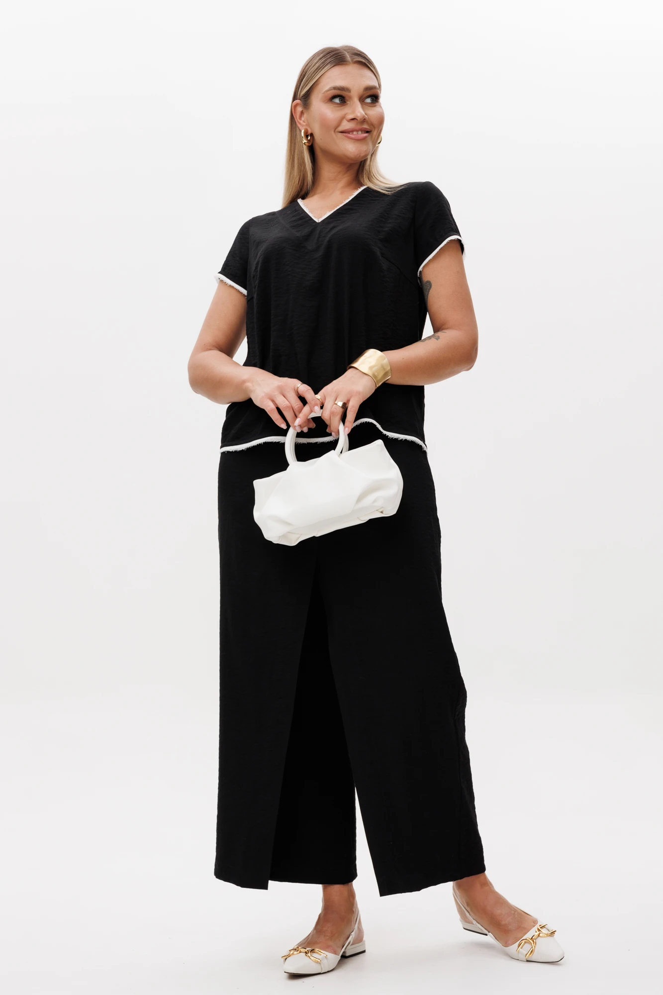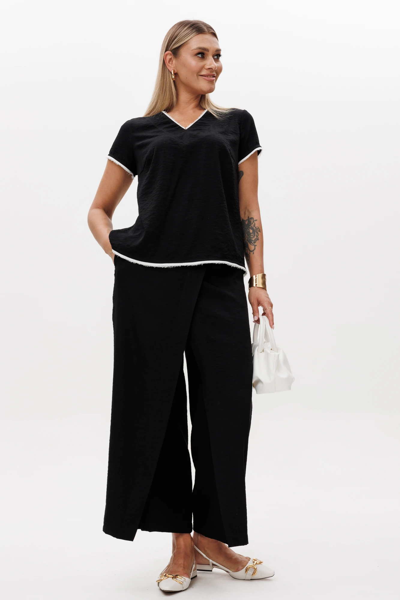Комплект двухпредметный, состоит из блузы и кюлотов. Блуза прямого силуэта с коротким рукавом и запахом на спине. По горловине, низу блузы и рукава отделочный кант контрастного цвета. Кюлоты прямого силуэта с запахом по переду. По перду боковые карманы. Застежка в боковом шве на потайную молнию. Пояс по спинке регулируется резинкой