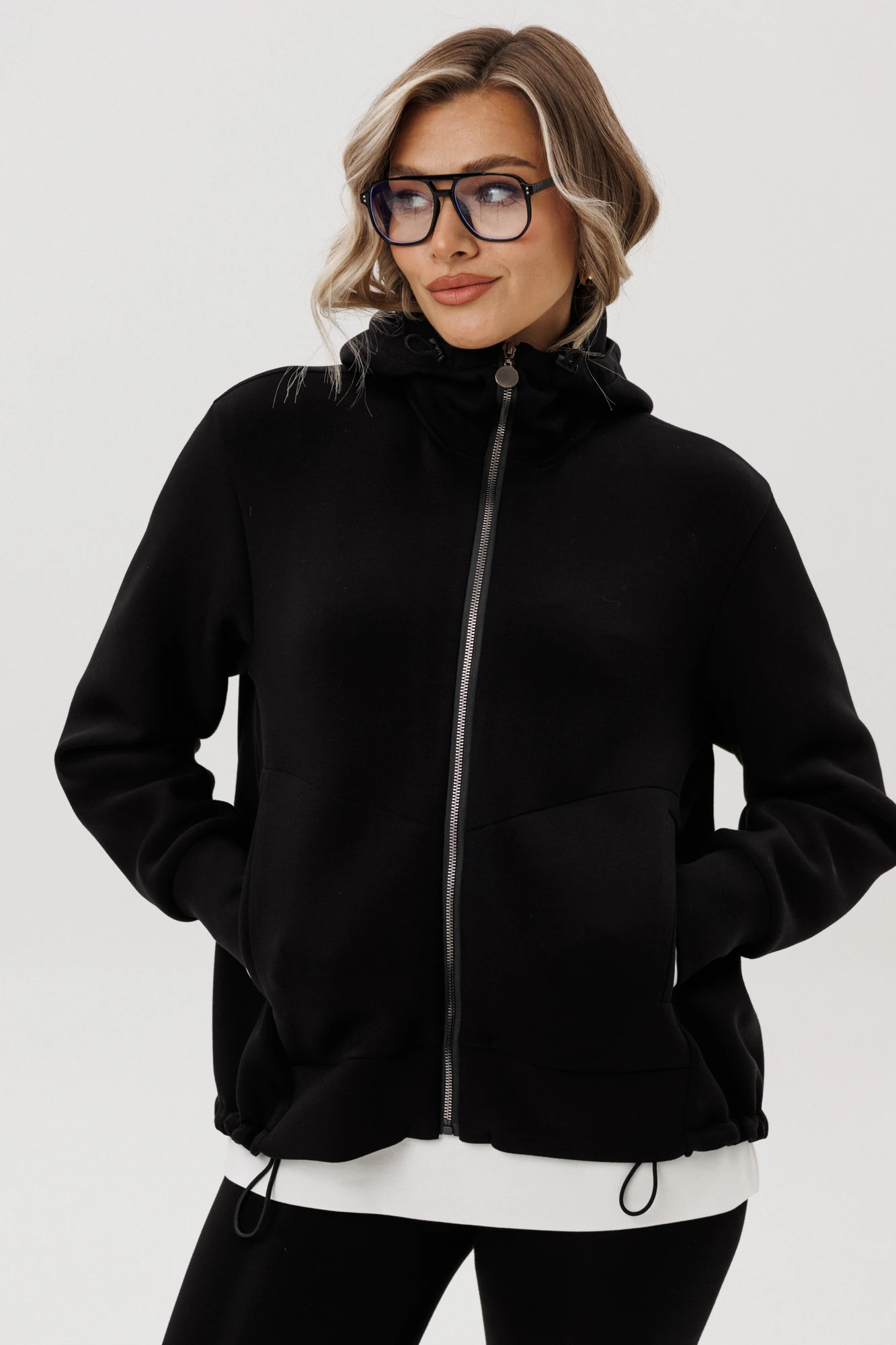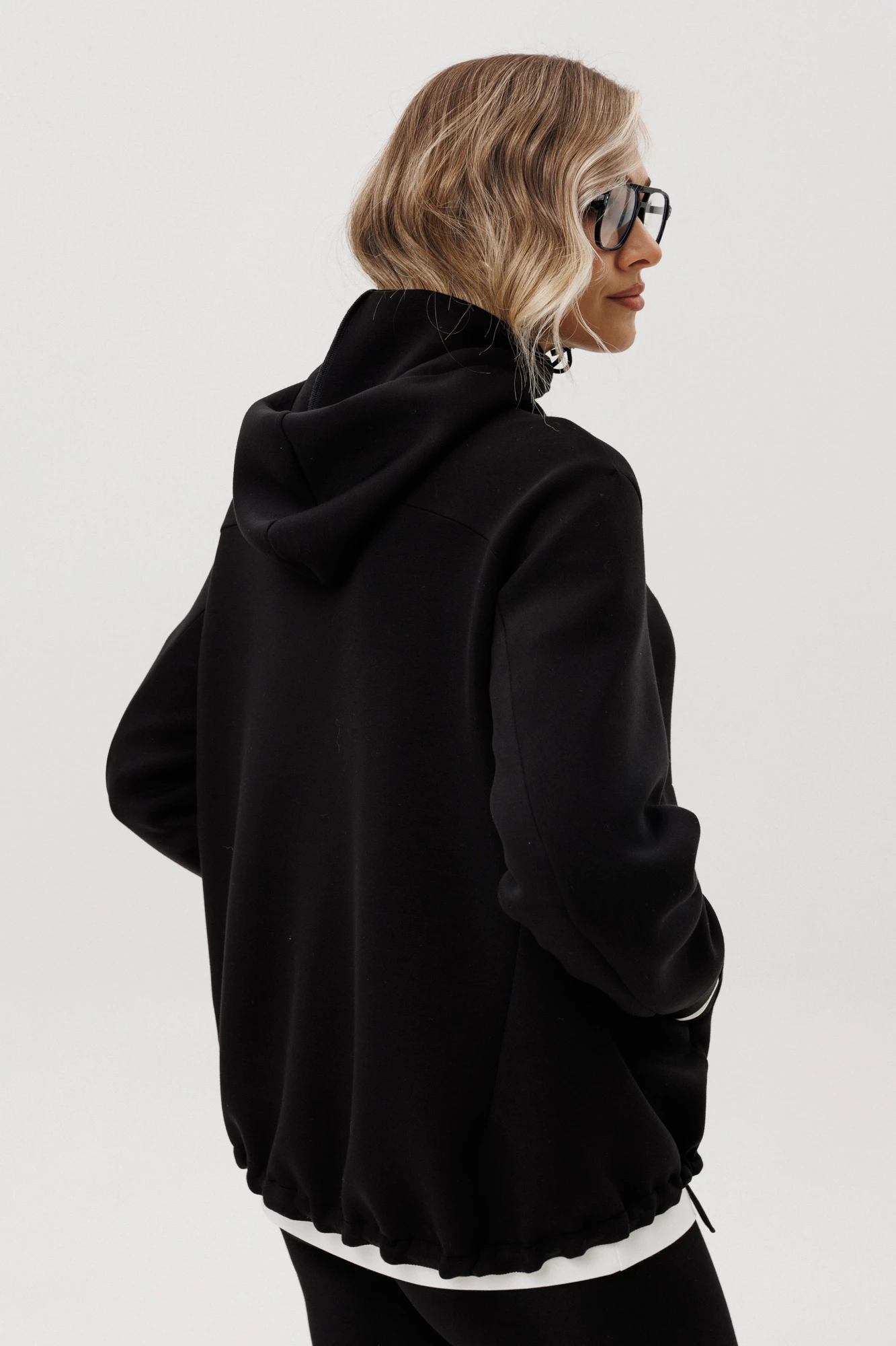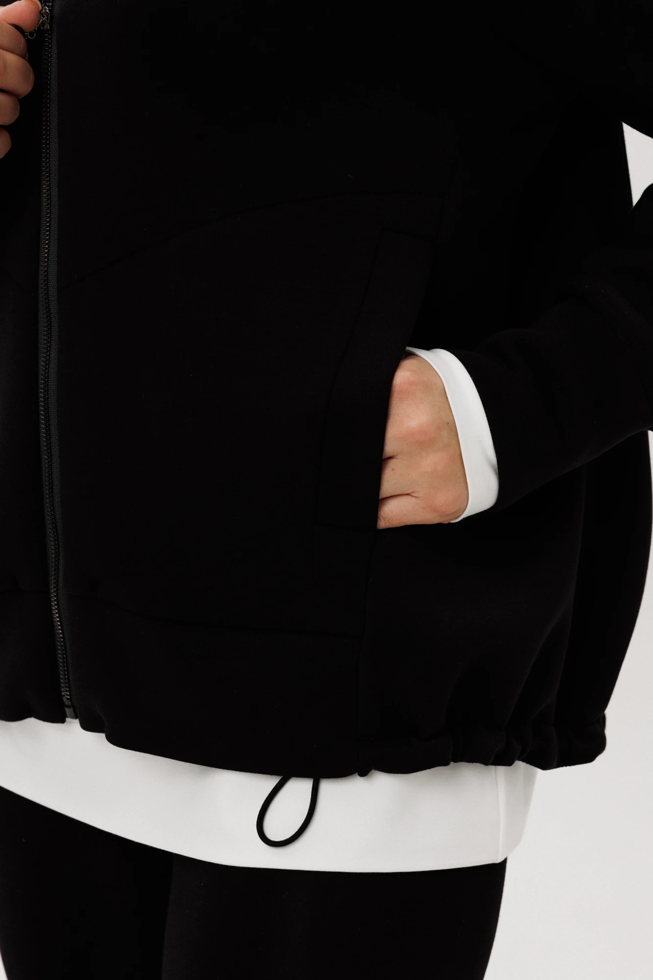 Комплект двухпредметный ,состоит из джемпера и леггинсов. Джемпер с капюшоном . По переду в рельефох карманы с листочкой. По спинке по низу эластичный шнур с фиксаторами. Застежка по переду на тесьму-молнию. Леггинсы плотного прилегания. По линии талии резинка.