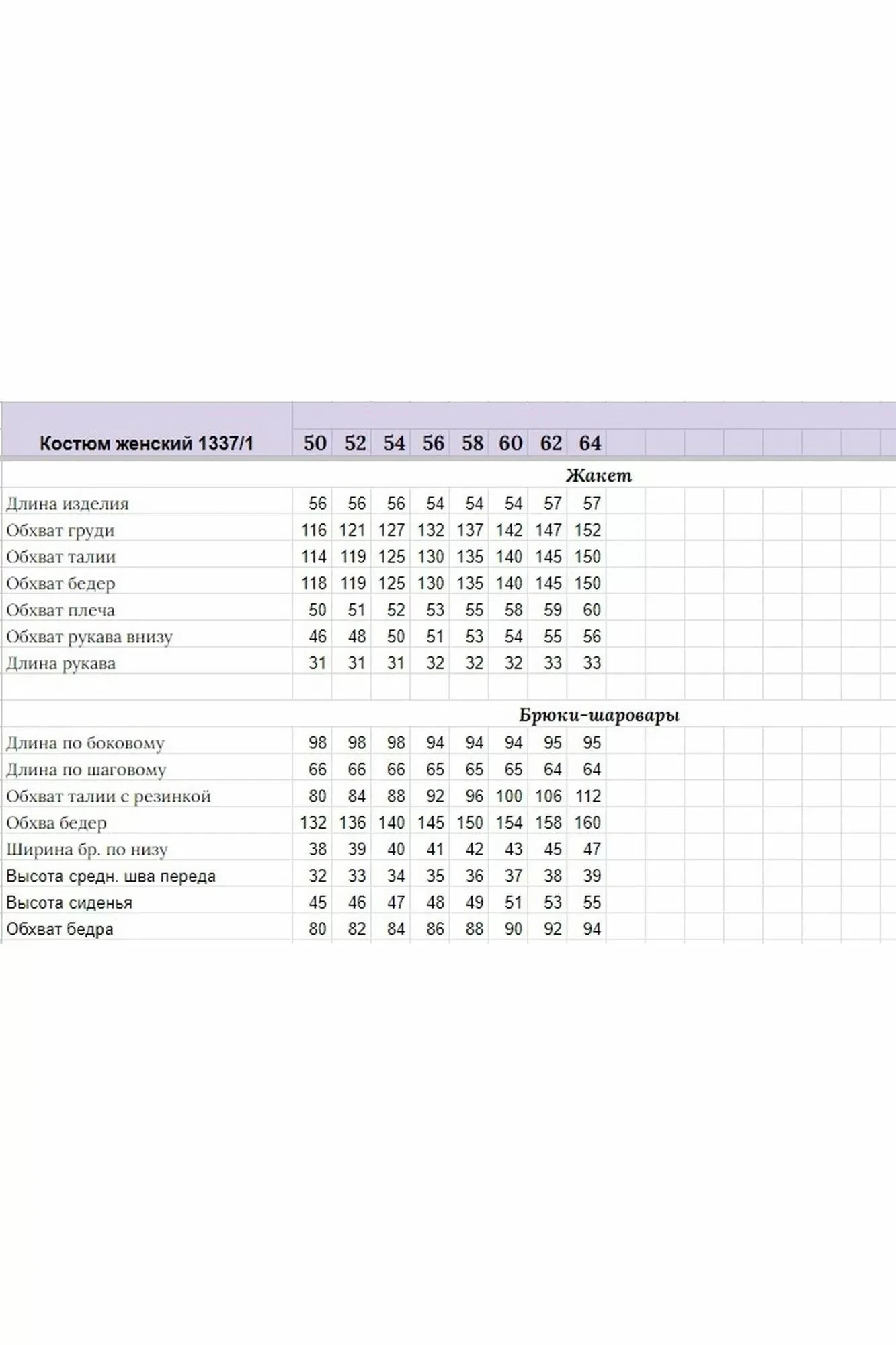 Длина жакета по спинке 57 см, длина рукава от горловины 33 см. Длина брюк по боковому шву 95 см, по шаговому 64 см. Изделие подойдет на рост 170 см.