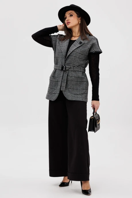 Эффектный и универсальный, удобный женский костюм состоящий из двух предметов: удлиненного жилета и брюк-палаццо. Изделие выполнено из костюмного твида. Жилет прямого полуприлегающего силуэта с пиджачным воротником (раскладными лацканами), также на жилете имеются прорезные карманы с листочками, на плечевом поясе вставки из контрастного черного трикотажа. Декором служит запонка на воротнике. Брюки- палаццо, по низу с цельнокроеной манжетой; по верху на притачном поясе с резинкой по спинке, застежка в левом боковом шве на тесьму молнию. К костюму прилагается съемный контрастный пояс с застежкой-карабином.