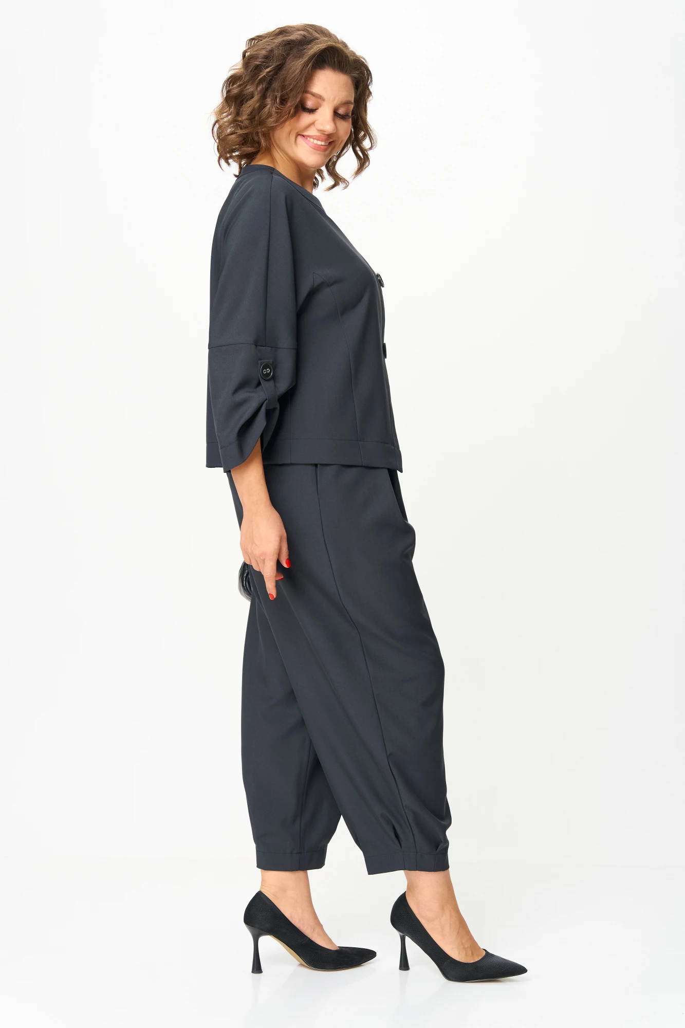 Универсальный костюм, который выглядит дорого и современно, но при этом дарит комфорт и лёгкость. Его можно носить как комплект или по отдельности: жакет с асимметричной застёжкой и акцентными пуговицами легко сочетается с джинсами, а брюки свободного кроя идеально смотрятся с блузой или футболкой.