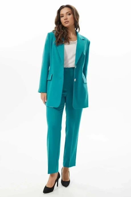Комплект женский состоит из жакета, брюк и топа. Жакет полуприлегающего силуэта удлинённый, с центральной застёжкой на две прорезные петли и пуговицы. Перёд жакета с талевыми вытачками и прорезными карманами и клапанами. Лацканы классической формы. Спинка со средним швом. Перед и спинка с рельефами от проймы до низа изделия. Рукава втачные двух шовные. Жакет на подкладке. Брюки женские с высокой посадкой, зауженные к низу, на притачном поясе, по спинке вытачки. По переду застёжка молния с гульфиком и откоском, вытачки, карманы. Пояс застёгивается на прорезную петлю и пуговицу. Топ свободного силуэта без рукава. По переду нагрудные вытачки, спинка с центральным швом. Горловина круглая