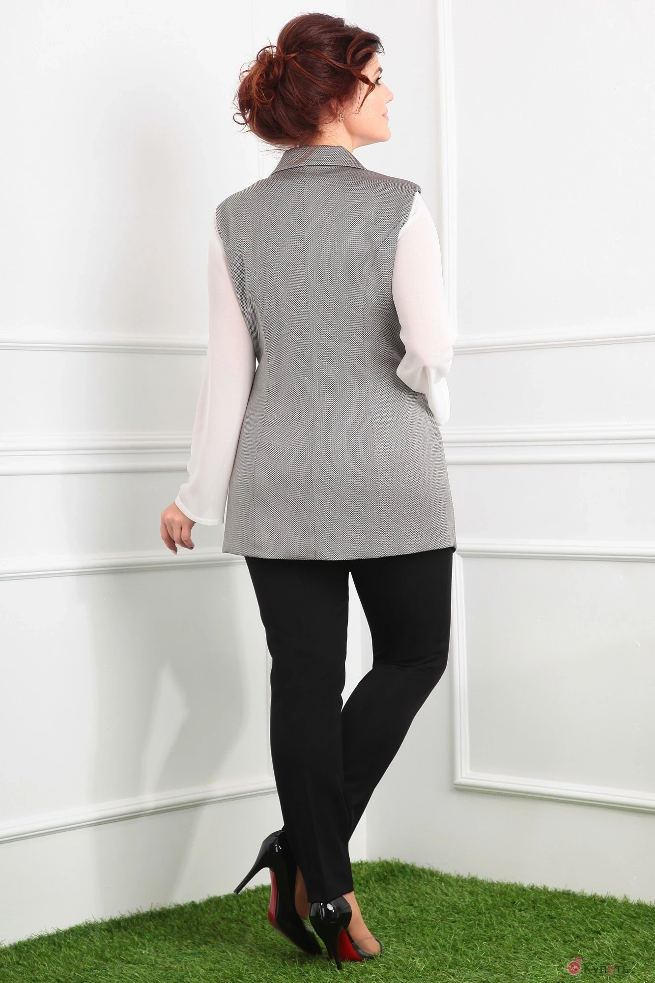 Комплект женский, состоящий из жилета и брюк. Жилет прилегающего силуэта. По переду жилета рельефы, выходящие из проймы и прорезные карманы в рамку. Спинка со средним швом. Жилет на подкладке. Застежка на петли пуговицы и пояс, концы которого, вставлены в боковые швы. По бокам карманы. Брюки прямые с заутюженными стрелками. Застежка на тесьму молнию. По переду брюк карман с отрезным бочком. В поясе резинок нет.