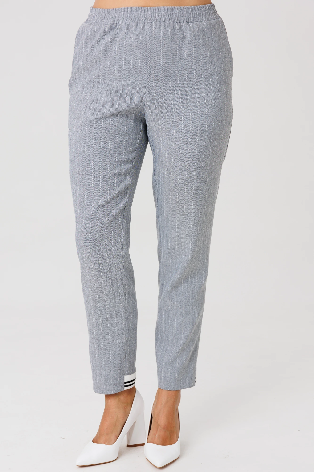 Брюки с высокой посадкой, зауженные к низу. В боковых швах функциональные карманы. Верхний срез брюк обработан притачным поясом на резинке