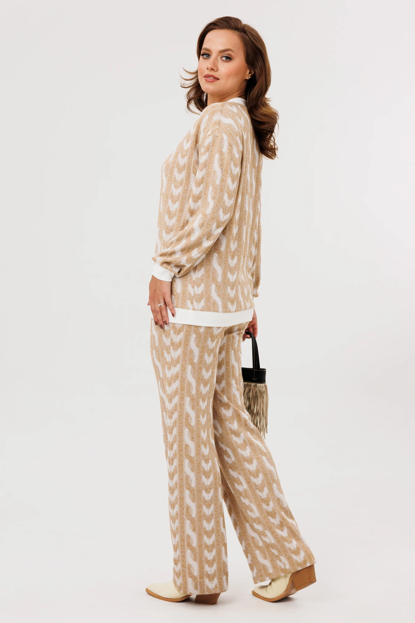 Стильный женский костюм, состоящий из джемпера и брюк.