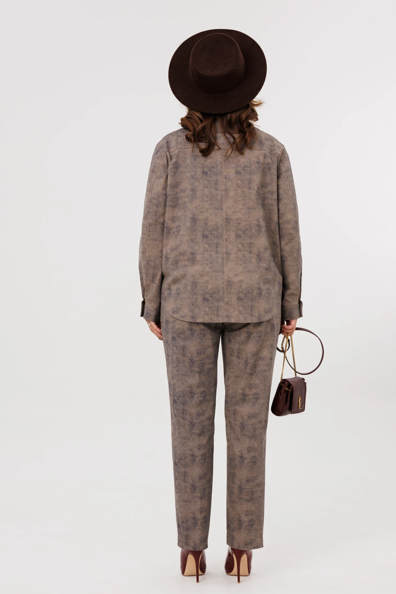 Стильный женский костюм состоит из рубашки и брюк, который выполнен из джинсовой ткани (не тянется). Рубашка прямого силуэта со спущенной линией плеча. По переду отрезные кокетки, в шов которых вставлен клапан, накладные карманы. По левому карману – пришивной лейбл. Застежка центральная на петли-пуговицы. Спинка с отрезной кокеткой, нижняя часть со средним швом. Рукава втачные, двухшовне, по низу с притачной манжетой, застегивающейся на пуговицу. Воротник отложной, рубашечного типа. По боковым швам разрезы, низ прямой, разноуровневый.