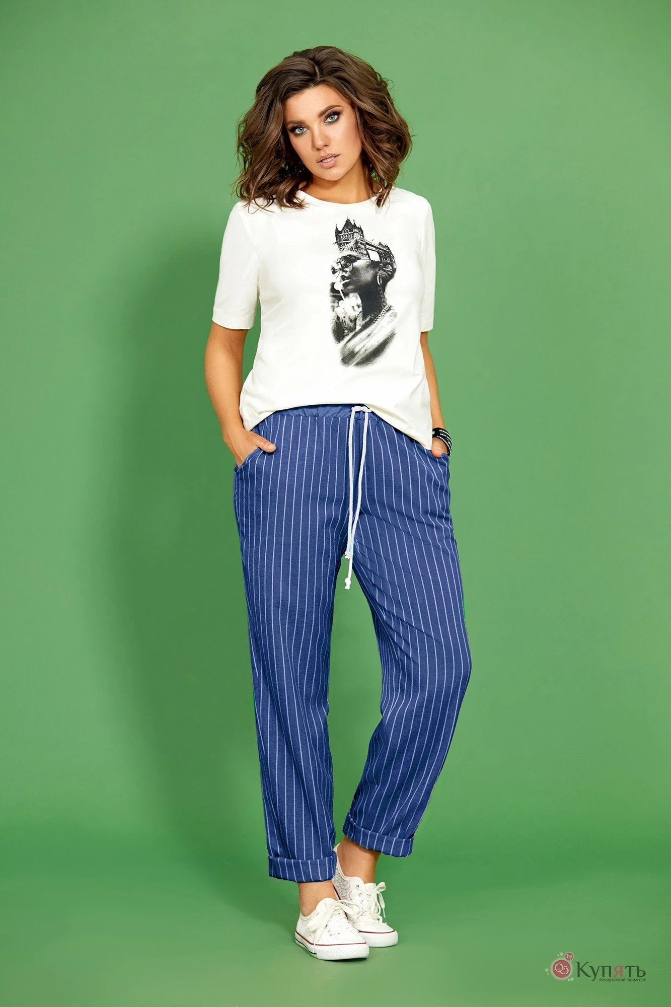 Костюм женский трех предметный, состоящий из жакета, блузы и брюк. Жакет полуприлегающего силуэта, удлиненный, выполнен из текстильного полотна в полоску (лён-вишер, не тянется). Вырез горловины глубокий с отворотом, застежка на одну петлю и пуговицу. Рукав втачной, по полочкам обработаны прорезные карманы с клапаном. По спинке отделочный элемент в виде широкого пояса. Блуза полуприлегающего силуэта из вискозы (тянется). Вырез горловины круглый, обработан обтачкой, рукав втачной. Декором служит принт по полочке. Брюки прямые, зауженные к низу, на притачном поясе. Пояс по кругу на резинке.