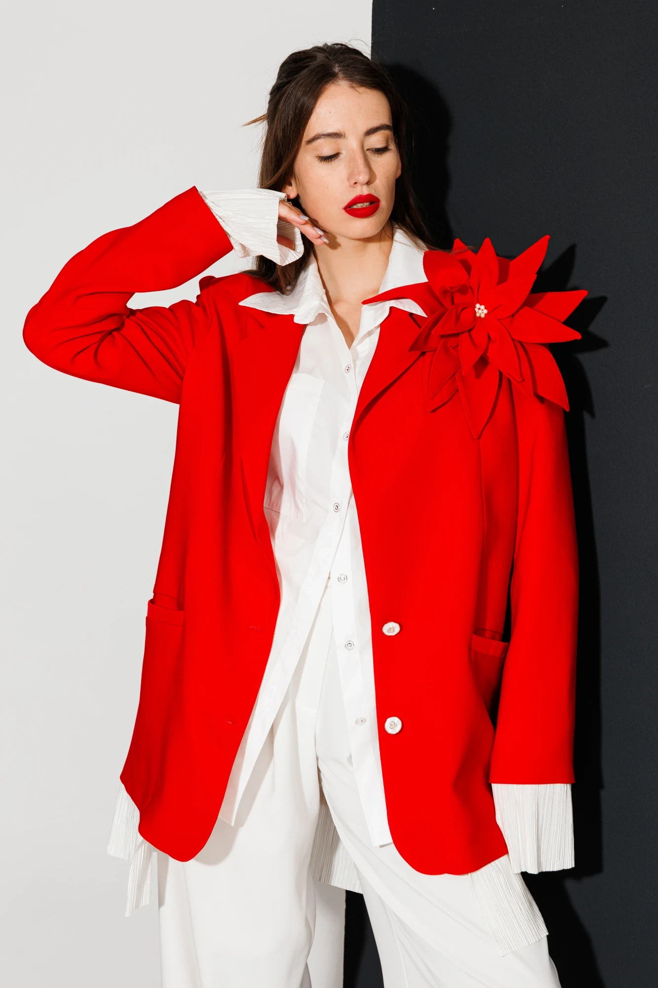 Костюм трехпредметный: состоит из брюк и жакета, галстука. Жакет прямого силуэта на подкладке. Спинка со средним швом. На полочке нагрудная вытачка переведена в прорезной карман с клапаном и листочкой. Линия плеч расширена. Рукава втачные, длинные, двухшовные. Воротник отложной, пиджачного типа на отрезной стойке. Однобортная застежка на петли и пуговицы. Отделочные детали из трикотажного гофре по низу рукава и самого изделия создают имитацию рубашки. Брюки прямого кроя, с карманами.По переду боковой карман, застежка на тесьму-молнию и пуговицу. По спинке верхний срез представлен резинкой. Галстук классический на резинке станет отличным дополнением к комплекту.