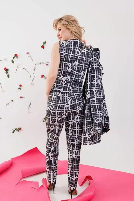 Костюм двухпредметный: жилет и брюки. Жилет полуприлегающего силуэта, на подкладке. По переду рельефа карманы "листочки", застёжка на петли-пуговицы. По спинке вытачки и хлястик. Длина изделия 50 см. Брюки полуприлегающего силуэта,зауженные к низу. По переду боковой карман, застежка на тесьму-молнию и пуговицу. Длина брюк 99 см.