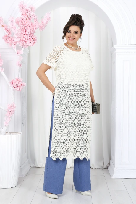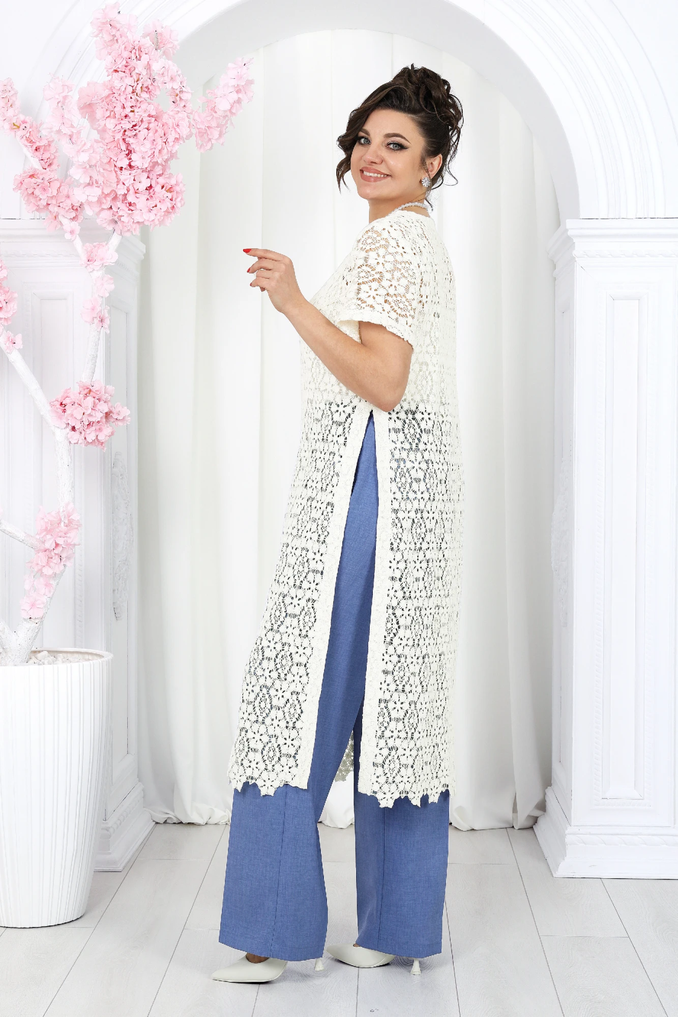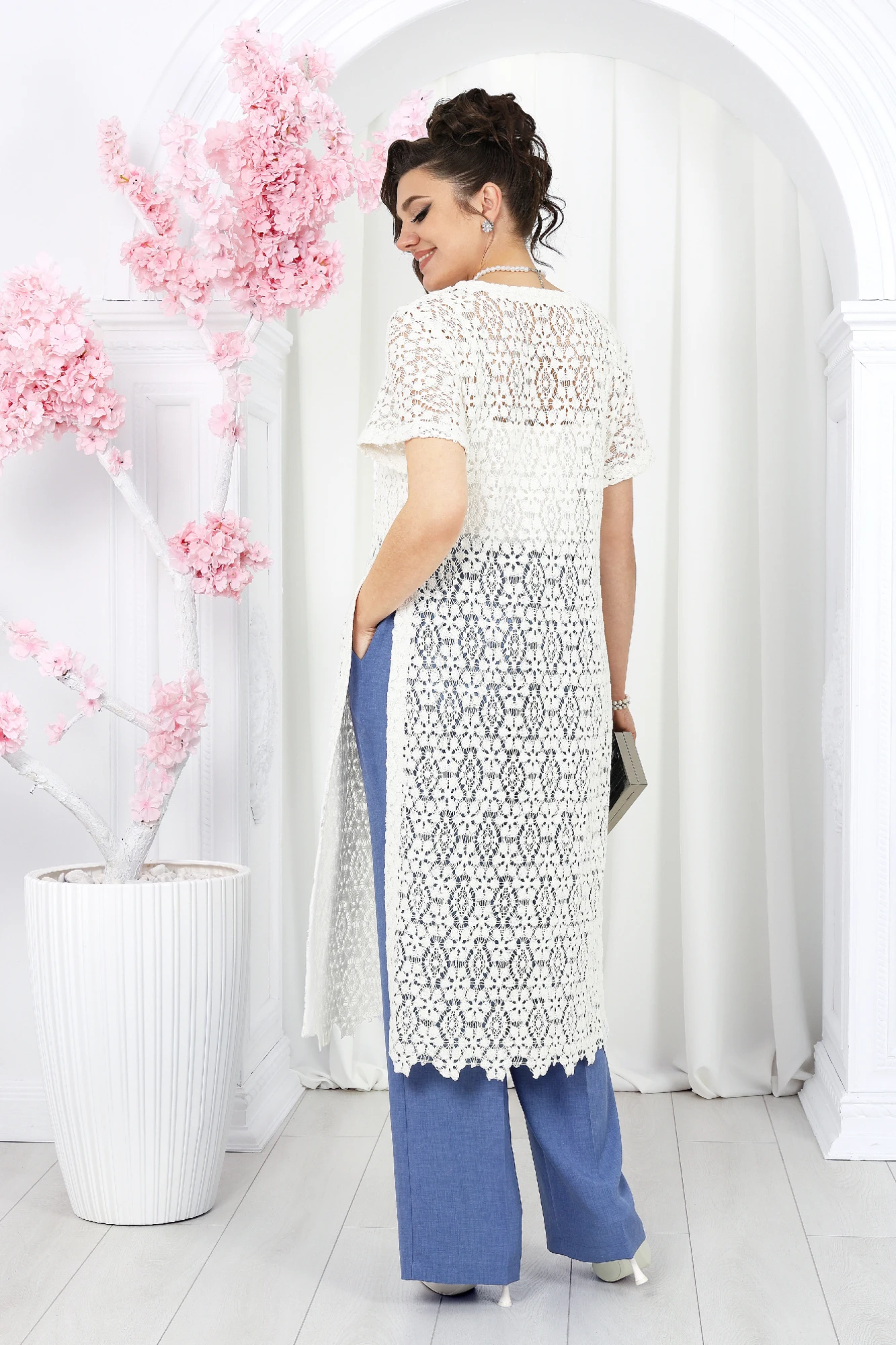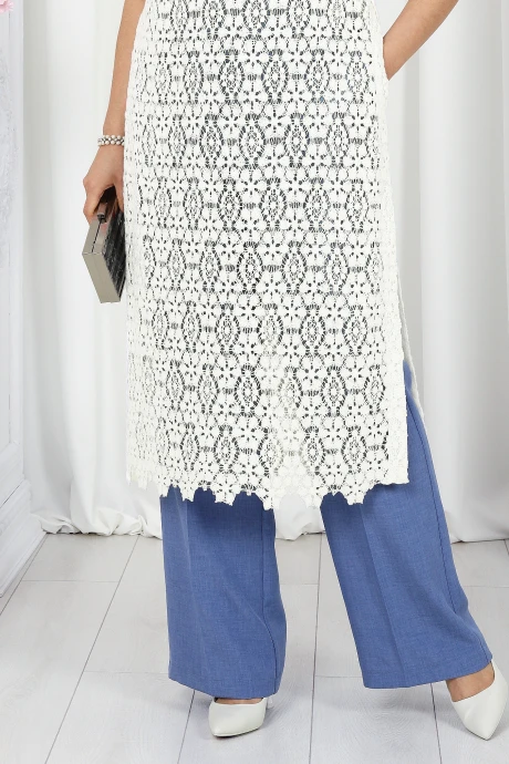 Представляем вашему вниманию летний брючный костюм, выполненный из натуральной ткани. Нарядная туника из вязаного кружева придаёт образу благородство и изысканность. Классические брюки с безупречной посадкой визуально вытягивают силуэт и делают его стройнее. Базовый топ завершает ансамбль, добавляя практичности и элегантности. Натуральная ткань обеспечивает дышащий эффект, поддерживая комфорт в теплую погоду. Этот праздничный костюм - настоящая находка для вашего гардероба. Он идеально подойдет для офиса, деловых встреч, а также для праздничных мероприятий или летних вечеров.