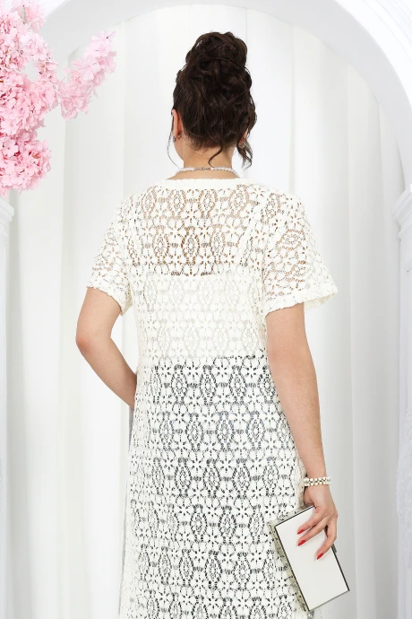 Туника полуприлегающего силуэта, выполнена из хлопкового кружева. Модель без застежки, без плечевых накладок, с высокими (от талии) разрезами в боковых швах. С изнанки разрезы обработаны хлопковой тесьмой в цвет кружева, закрепленной с лицевой стороны отделочной строчкой шириной 3 см. Круглый вырез горловины переда и спинки обработан обтачкой из костюмно-плательной ткани в цвет кружева; ширина отделочной строчки по горловине 2 см. Рукав втачной, короткий. Длина туники – 117 см; длина рукава – 22 см.