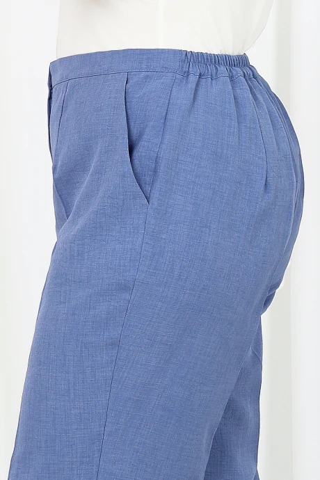 Брюки классические, длинные, с посадкой на талии, выполнены из ткани «лен-вишер». Модель со стрелками. Передние и задние половинки брюк с талиевыми вытачками, направленными от пояса вниз. Спереди обработаны наклонные боковые карманы и центральная застёжка на тесьму-«молнию». Притачной пояс застегивается на 1 петлю и 1 пуговицу; для лучшего прилегания по линии талии в притачном поясе предусмотрена эластичная лента, вставленная по спинке.