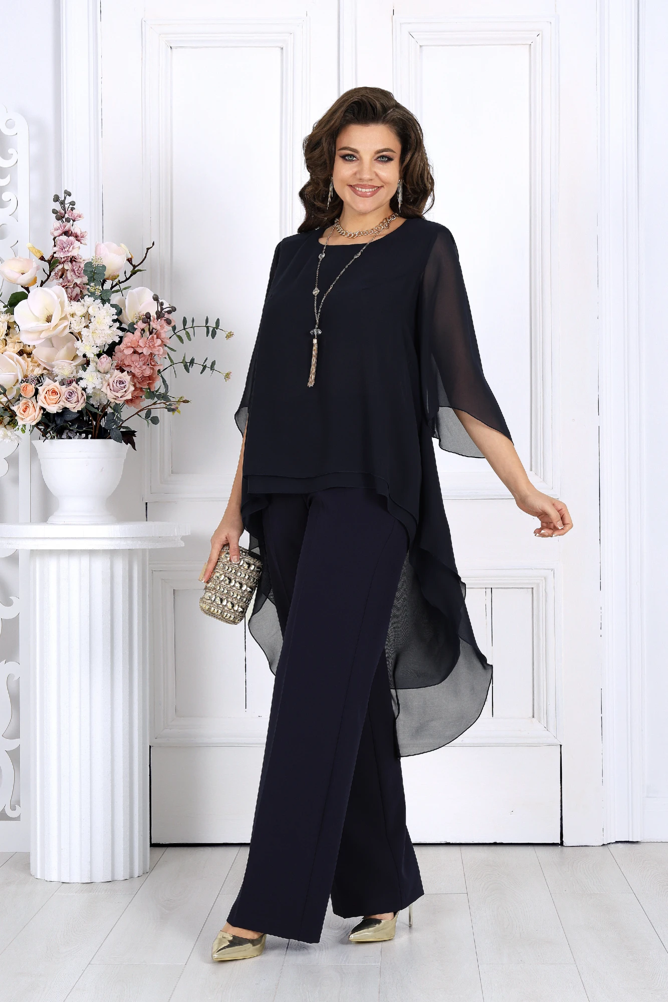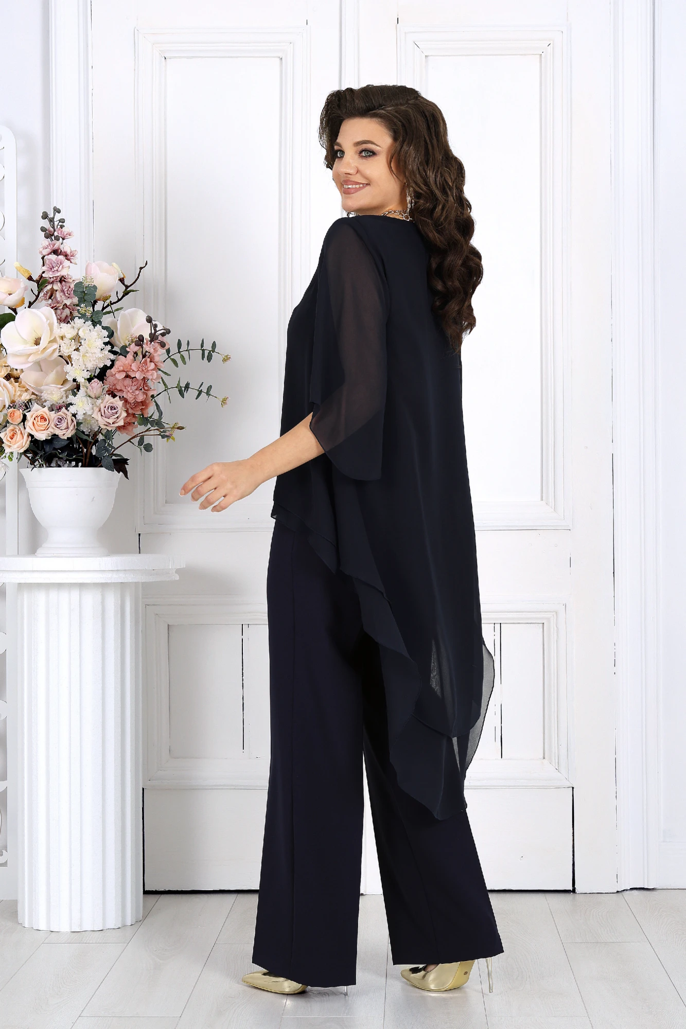 Элегантный брючный костюм – идеальный выбор для вечернего выхода, торжества или особого случая. Легкая шифоновая туника с асимметричным кроем и струящимися рукавами добавляет образу воздушности и утонченности. Удлиненная спинка делает силуэт элегантным и зрительно вытягивает фигуру. Прямые классические брюки из костюмной ткани великолепно садятся по фигуре, обеспечивая комфорт на протяжении всего дня. Идеально подойдет для вечернего выхода, праздников и торжественных мероприятий. Легкий и женственный образ для любого типа фигуры.