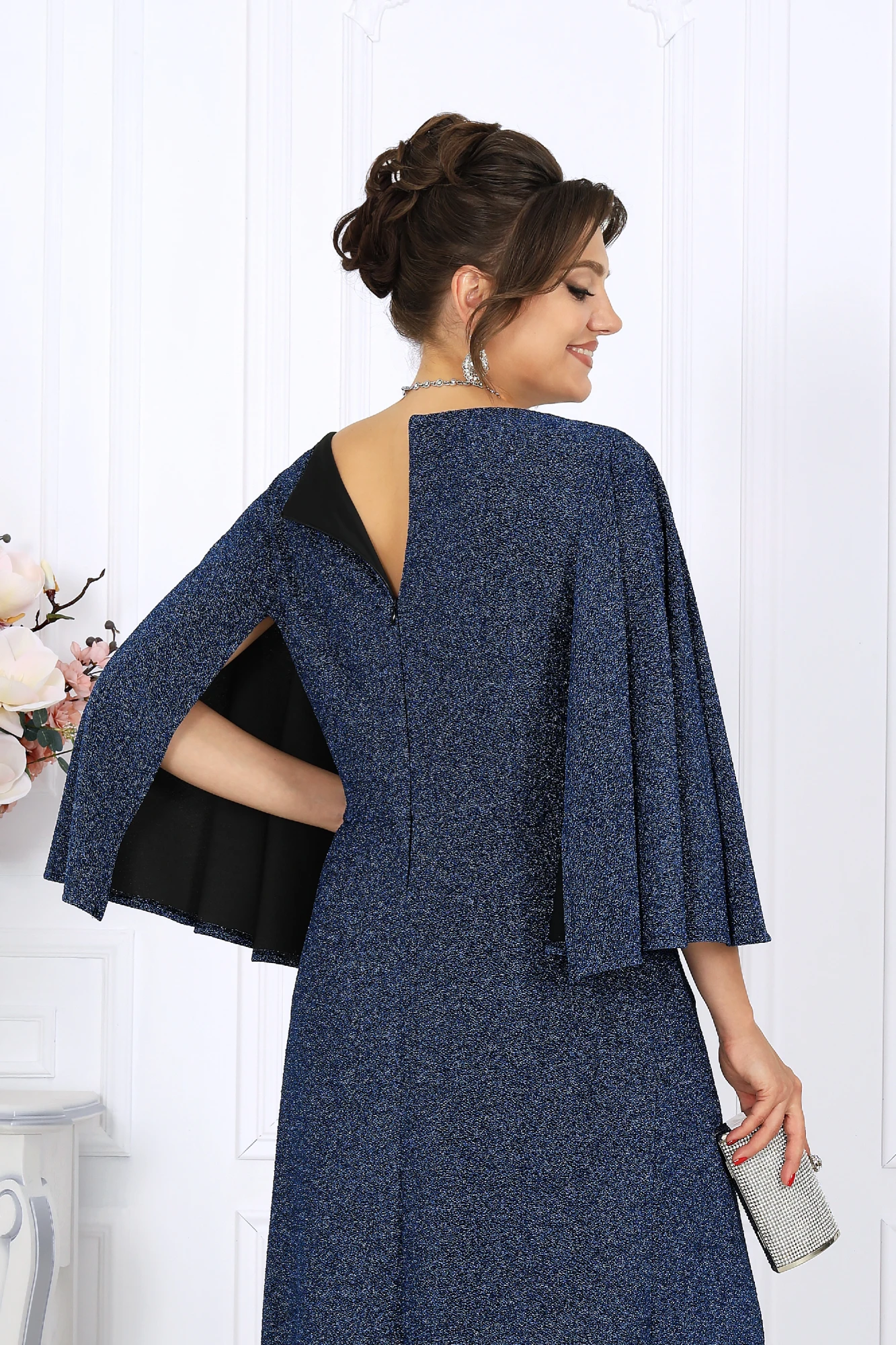 Туника свободно струится по фигуре, легко скрывая всё лишнее и подчеркивая достоинства. Драпировка по линии талии формирует красивый силуэт «песочных часов», а асимметричный запах добавляет образу динамики и утончённости. Эффектные рукава придают наряду торжественность, сохраняя при этом абсолютную лёгкость движений. Каждая деталь продумана до мелочей — от мягкой подкладки, обеспечивающей комфорт, до аккуратной потайной застёжки, сохраняющей чистоту линий.