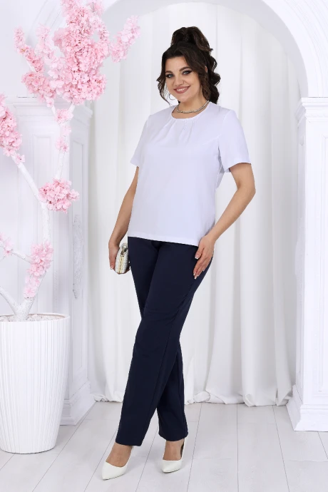 Джемпер полуприлегающего силуэта, выполнен из хлопкового трикотажного полотна. Перед с нагрудными вытачками, выходящими из пройм. От горловины вниз застрочены 4 складки. Горловина переда и спинки округлой формы, по переду углубленная. Срезы горловин окантованы косой бейкой. Рукав втачной, короткий.