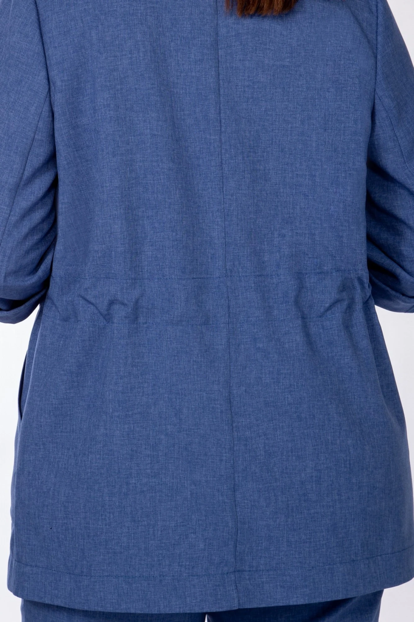 Жакет прямого силуэта без подкладки и без застежки. По бокам накладные карманы.