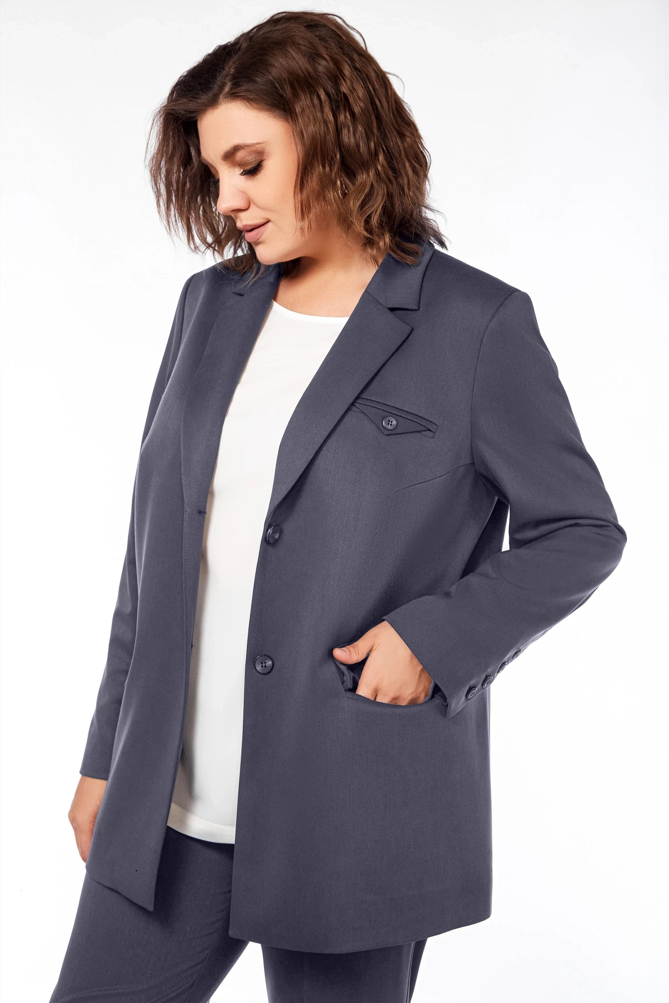 Костюм трехпредметный: жакет, блузка, брюки. Жакет прямого силуэта, на подкладке, с нагрудными вытачками, карманы с клапанами в рамку, в верхней части декоративная листочка с пуговицей, по спинке средний шов с глубокой шлицей, начинается на уровне лопаток. Рукав двухшовный, по локтевому шву шлицы с застежкой на четыре пуговицы. Блузка прямого силуэта, с нагрудными вытачками, разрезами в боковых швах, без рукава. Брюки слегка заужены к низу, на поясе, по спинке резинка, застежка на пуговицу и тесьму-молнию, с наклонными карманами к боковому шву, справа на заднем полотнище декоративный карман в рамку с пуговицей.