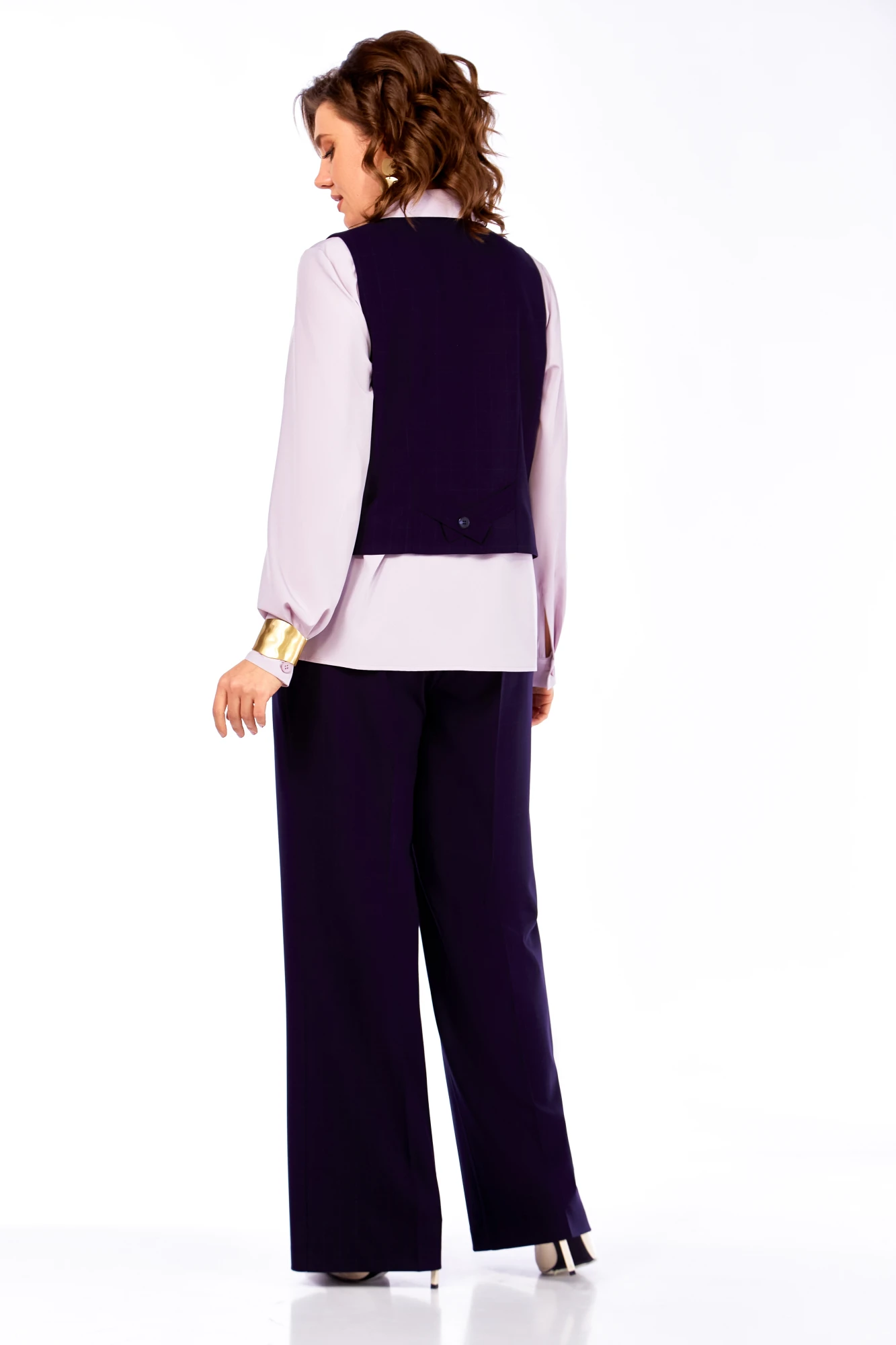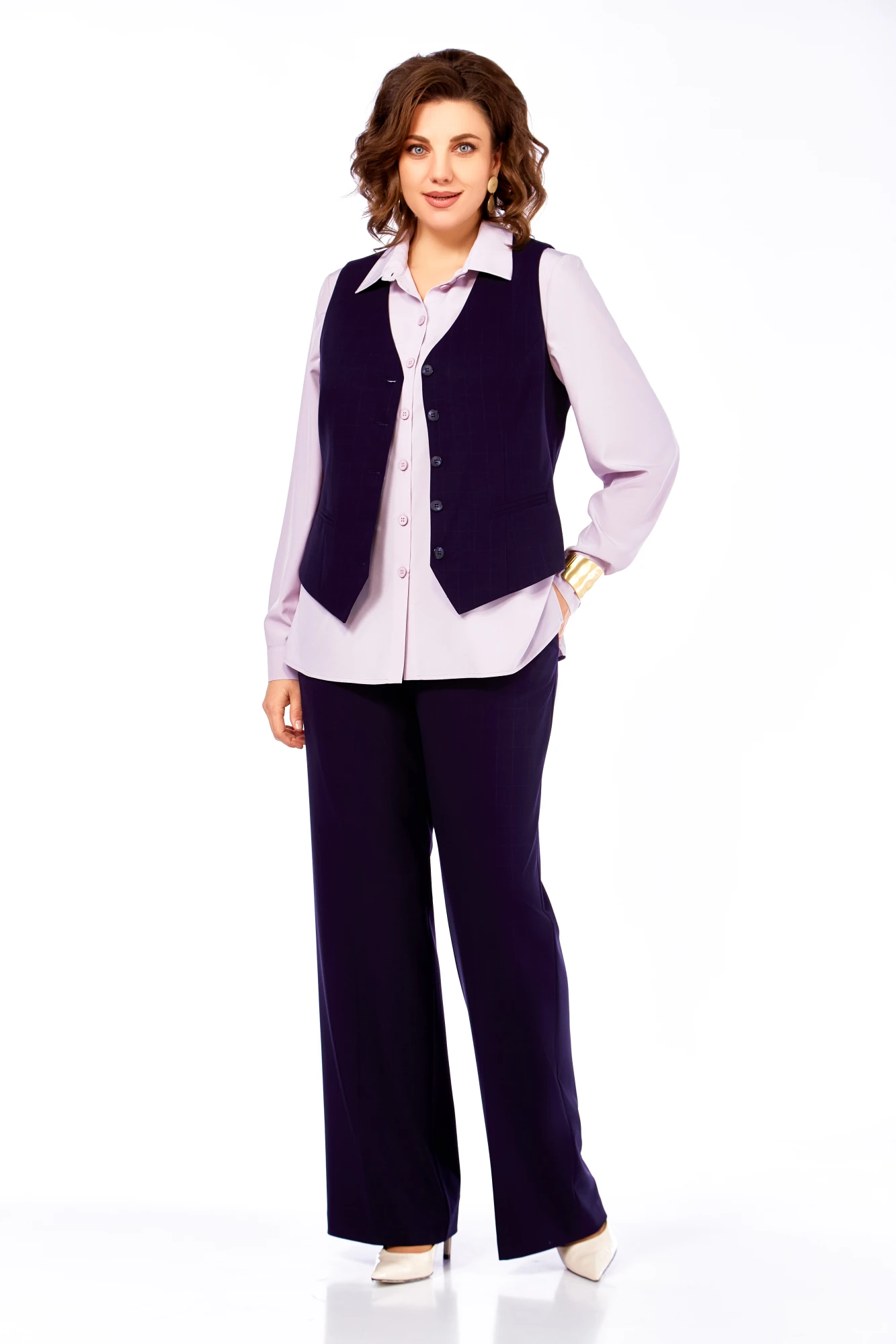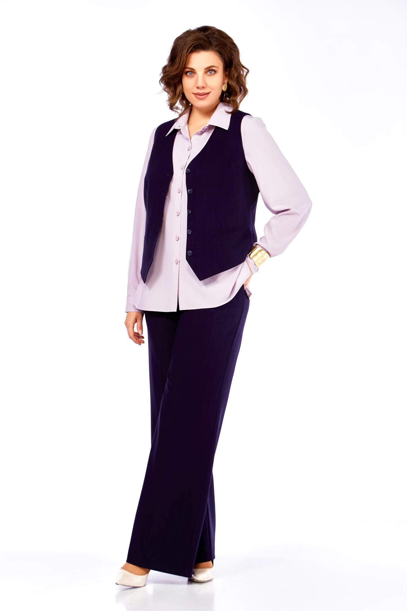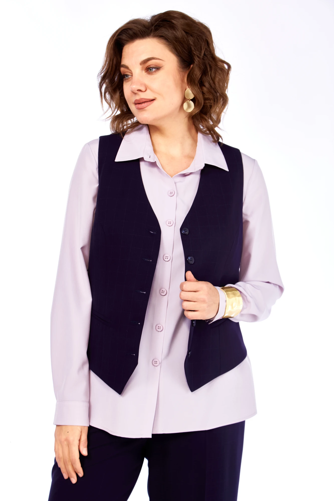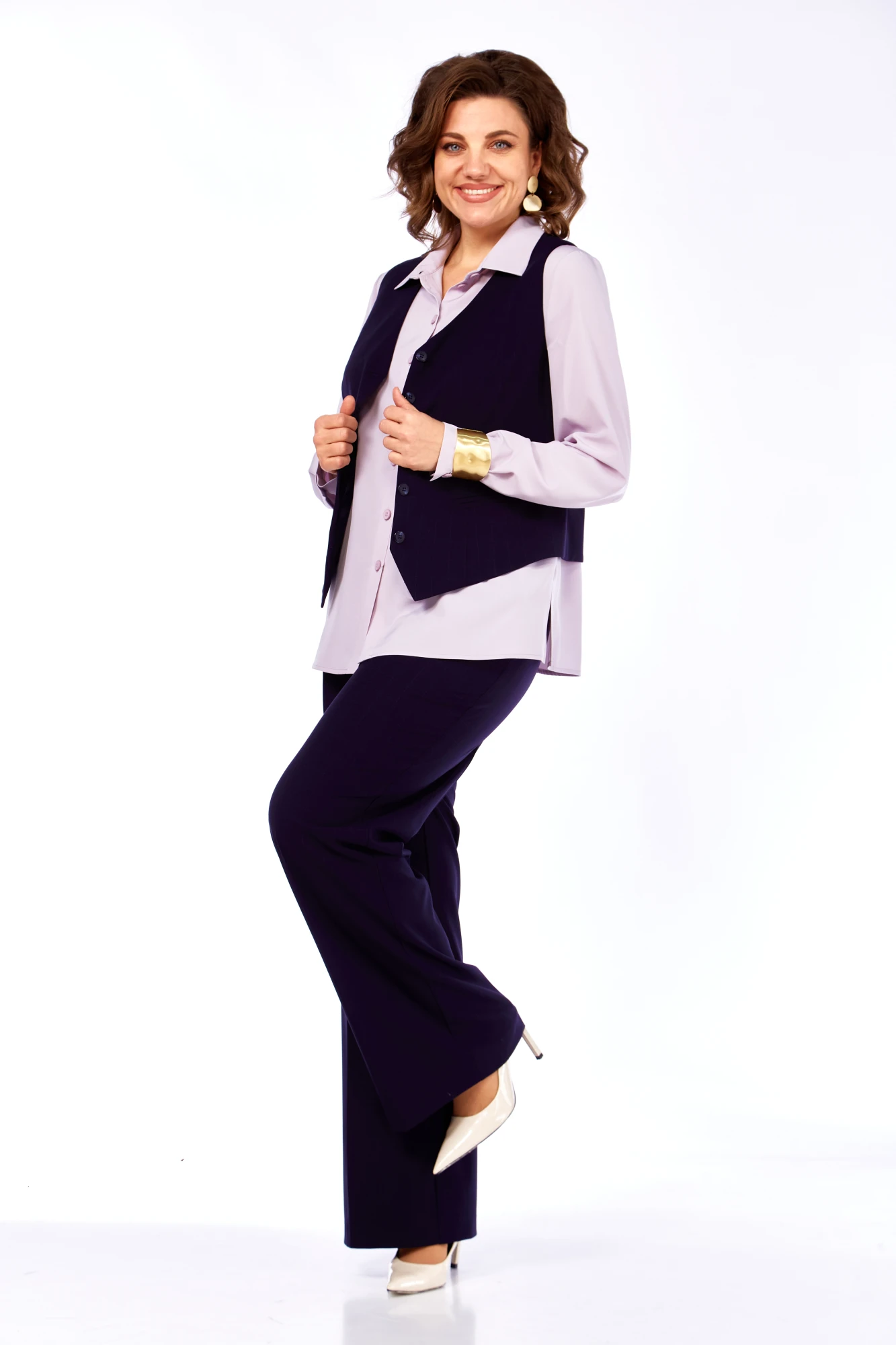 Комплект женский, состоит из блузки, жилета и брюк. Полуприлегающий силуэт, жилет с V-образной формой горловины, на переде рельефы от проймы, имитация карманов с клапаном, по спинке хлястик с пуговицей. Блузка с рубашечным воротником и застежкой на петли и пуговицы, нагрудные вытачки, рукав одношовный с манжетой. Разрезы в боковых швах. Брюки прямые, с карманами. Пояс по спинке на резинке. На переде и спинке заутюжены стрелки.