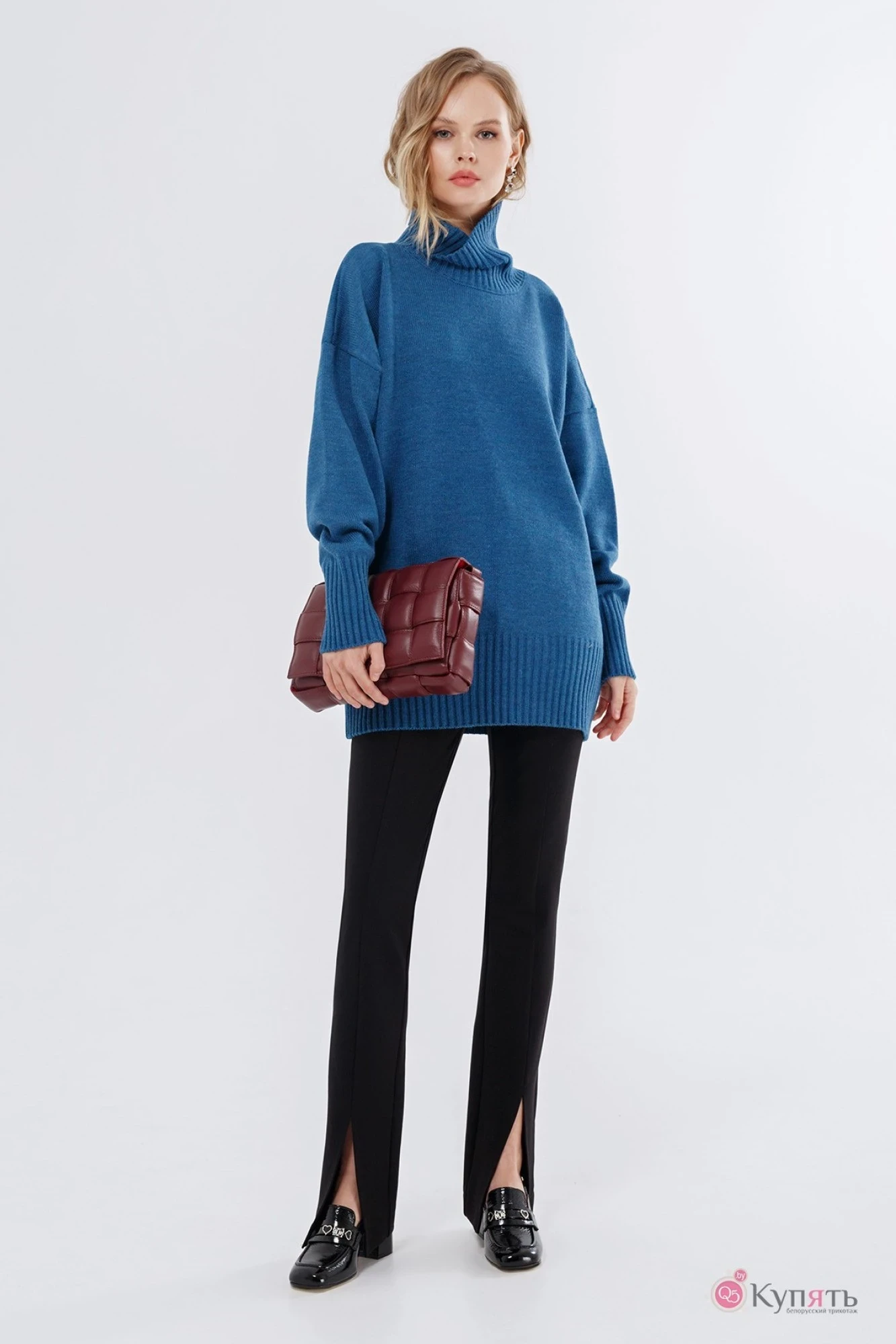 Комплект-двойка из свободного удлиненного свитера и трикотажных брюк с разрезами. Детали: трикотажный свитер прямого силуэта со спущенной линией плеча, широкий воротник-стойка, рукава удлиненные с высокими манжетами. Брюки с высокой посадкой на притачном эластичном поясе, передние части брюк с рельефами и разрезами по низу. Отдельно свитер представлен под арт. 1985