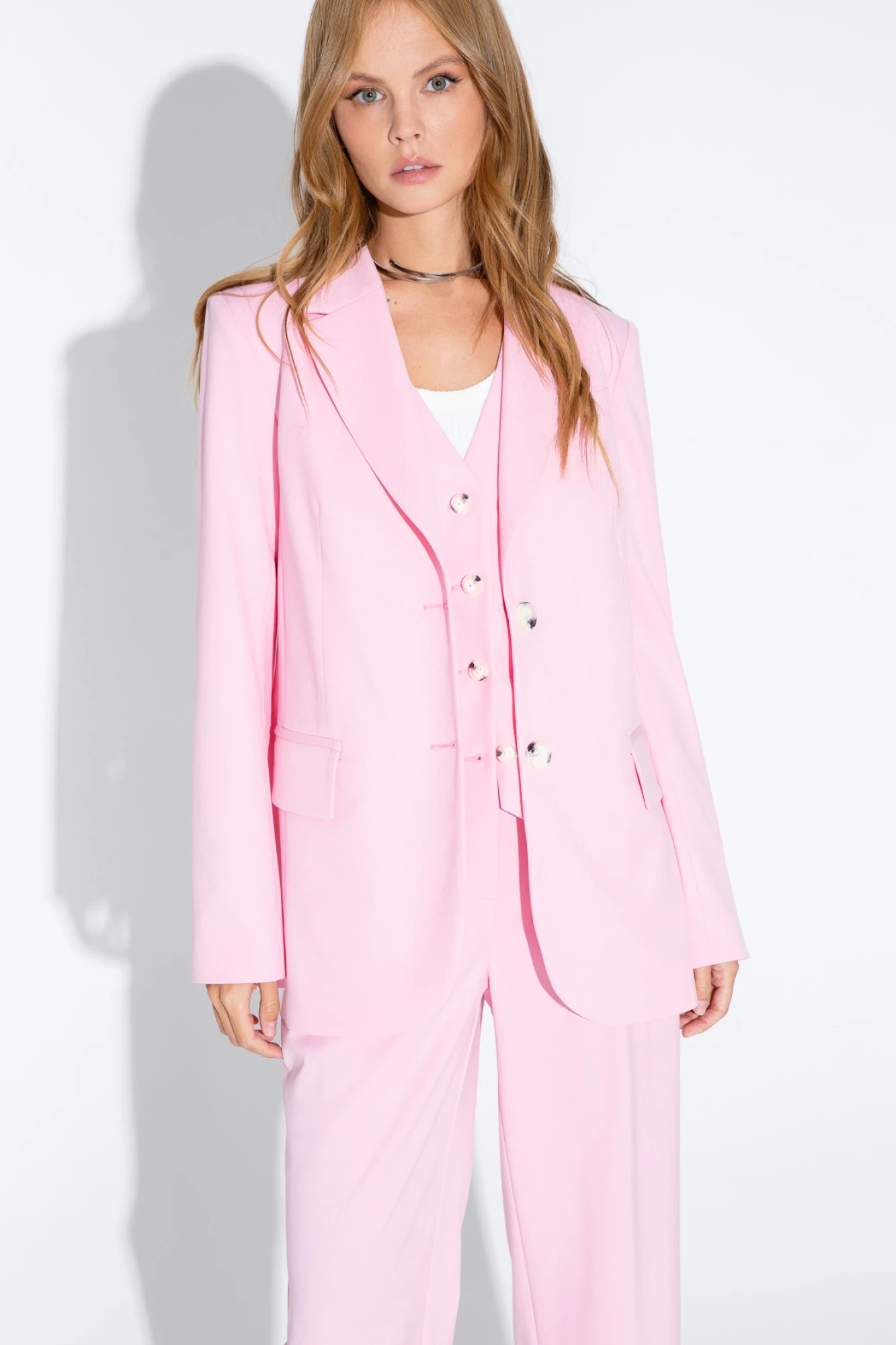 Текстильный костюм-тройка из свободного жакета со шлицами, жилета и брюк со складками Детали: жакет полуприлегающего силуэта, талиевые вытачки, пиджачный воротник, застежка на две петли и пуговицы, функциональные карманы, рукава и спинка со шлицами, жакет на подкладке из 100% вискозы. Жилет полуприлегающего силуэта с фигурным низом, застежка на петли и пуговицы, на подкладке из 100% вискозы. Брюки с высокой посадкой, притачной пояс со шлевками, задняя часть пояса эластичная- с резинкой, застежка на молнию и пуговицу, боковые карманы, передние половины с двумя складками Длина жакета по спинке около 70 см в размерах 40-46 и около 73 см в размерах 48-52 Длина рукавов около 63 см Длина жилета по спинке около 48,5 см в размерах 40-46 и около 51,5 см в размерах 48-52 Длина брюк по боковому шву с поясом около 99,5 см в размерах 40-46 и около 101 см в размерах 48-52, длина по внутреннему шву около 70 см