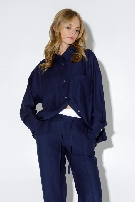 Костюм-тройка из свободной рубашки, топа-бюстье и широких брюк с декоративным поясом. Детали: рубашка прямого силуэта, спущенная линия плеча, накладные карманы, застежка на петли и пуговицы, удлиненные рукава с притачными манжетами. Топ без застежки, широкие бретели с резинками, сборка по низу чашки лифа, прилегание достигается за счет эластичных бретелей, на подкладке. Брюки с высокой посадкой, пояса на резинке, верхний пояс выполнен из отделочной ткани, боковые карманы. Длина рубашки по спинке около 65 в размерах 40-46 и около 68 см в размерах 48-52, длина рукава+ плечо около 50+11=61 см. Длина топа от плечевого шва около 37 см в размерах 40-46 и около 39 см в размерах 48-52. Длина брюк по боковому шву с поясом около 111 см в размерах 40-46 и около 112 см в размерах 48-52, длина по внутреннему шву около 79 см