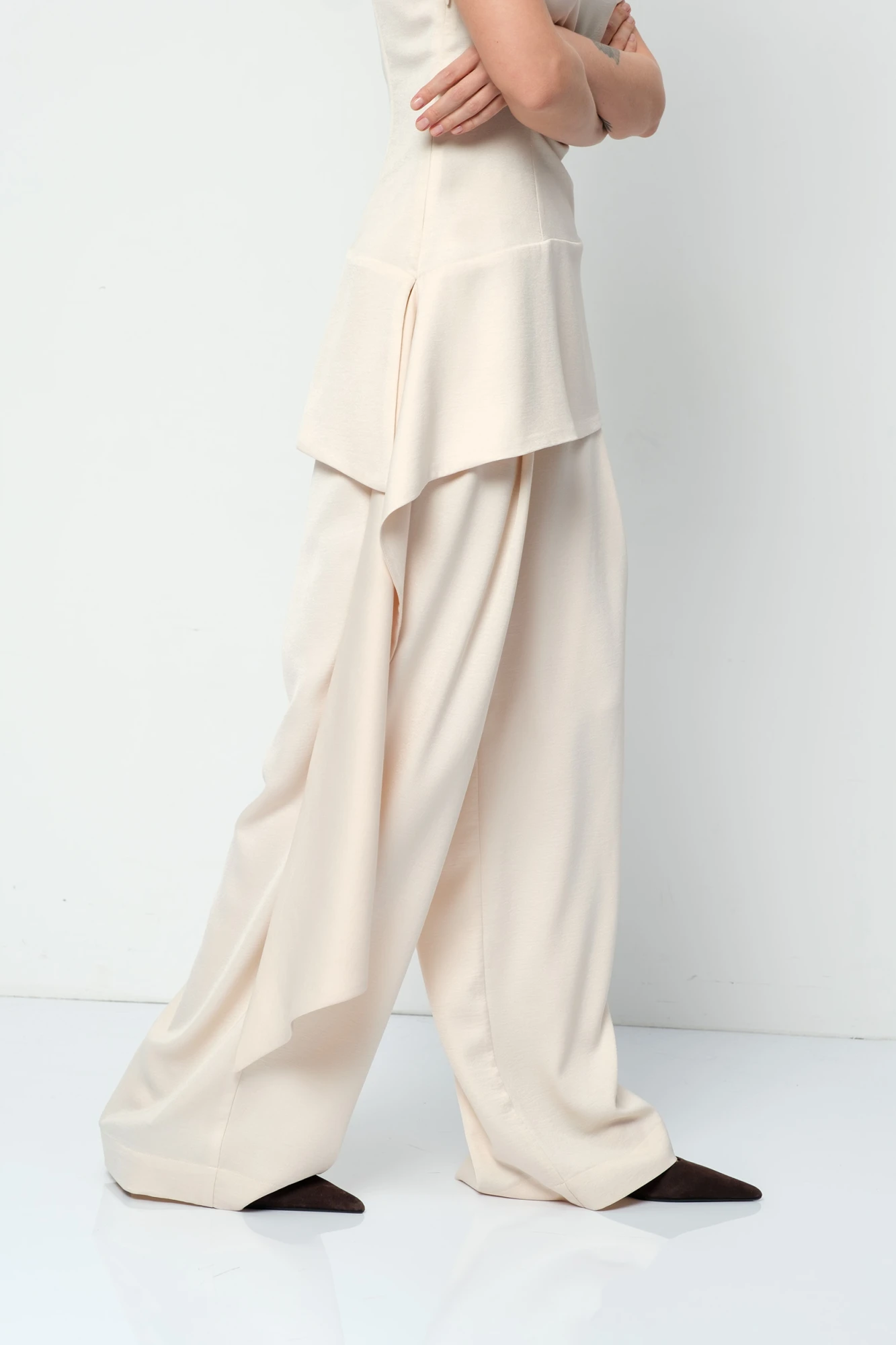 Атласный костюм-двойка из приталенной асимметричной блузы и широких брюк. Детали: туника приталенного силуэта, широкая горловина переда и спинки, талиевые вытачки, фигурный низ, потайная застежка-молния в среднем шве спинки. Брюки с высокой посадкой, передние половины брюк с двумя складками, эластичный пояс-резинка, боковые карманы, без застежки. Длина туники по спинке около 64,5 см. Длина брюк по боковому шву с поясом около 108 см, длина брюк по внутреннему шву около 79,5 см