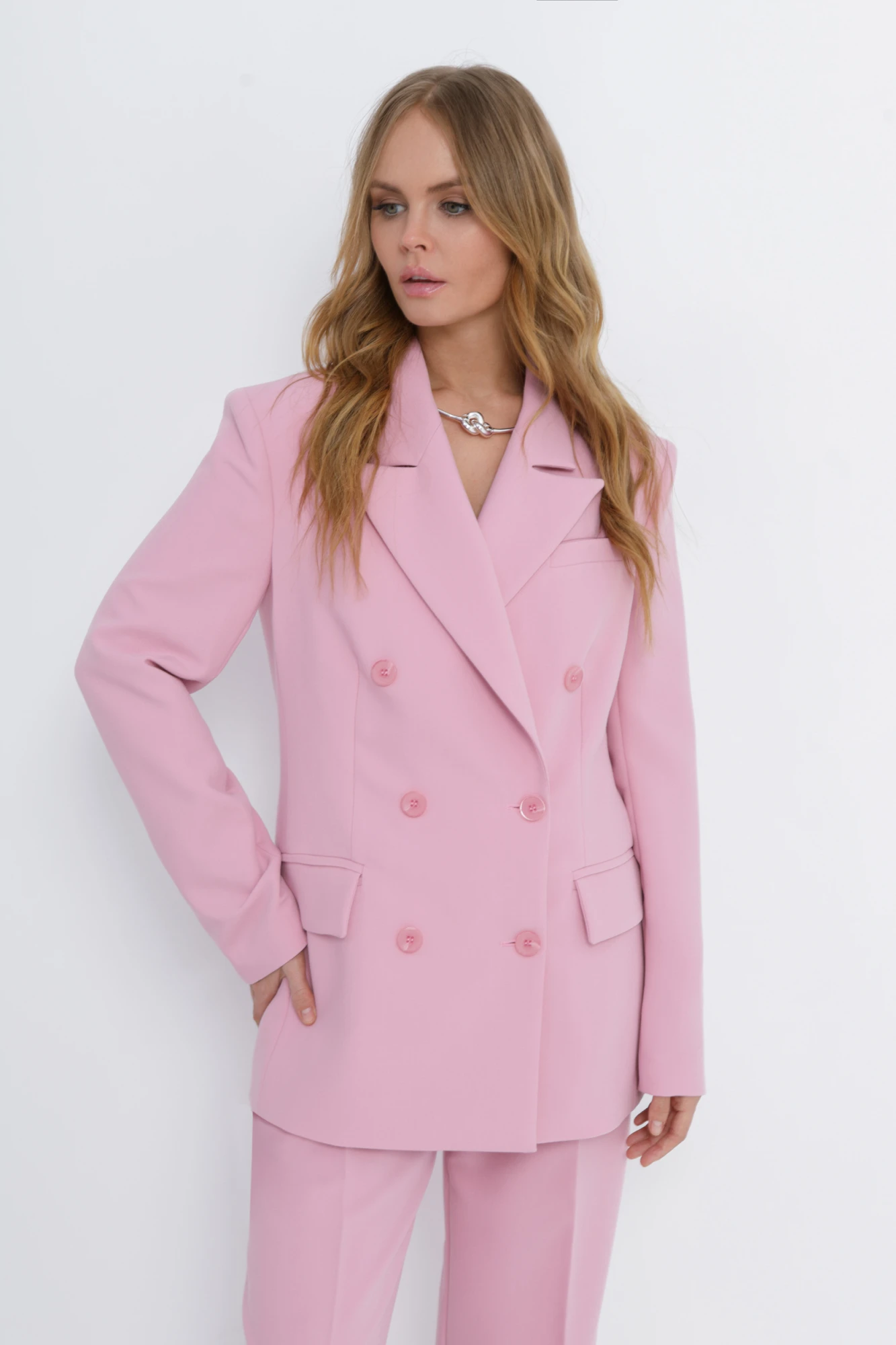 Текстильный костюм-двойка из свободного жакета и прямых широких брюк со стрелками. Детали: жакет свободного покроя и полуприлегающего силуэта, двубортная застежка на петли и пуговицы, отрезные бочки, пиджачный воротник, функциональные карманы, жакет на подкладке. Брюки с высокой посадкой, притачной пояс со шлевками, передние половины с небольшими застроченными мягкими складками и заутюженными стрелками, застежка на молнию и пуговицу, боковые карманы. Задние части брюк с вытачками и заутюженными стрелками. Пояс брюк прямой, без резинки. Длина жакета по спинке около 69 см в размерах 40-46 и около 72 см в размерах 48-52, длина рукавов около 62 см. Длина брюк по боковому шву с поясом около 114 в размерах 40-46 и около 115,5 см в размерах 48-52. Длина по внутреннему шву около 83 см
