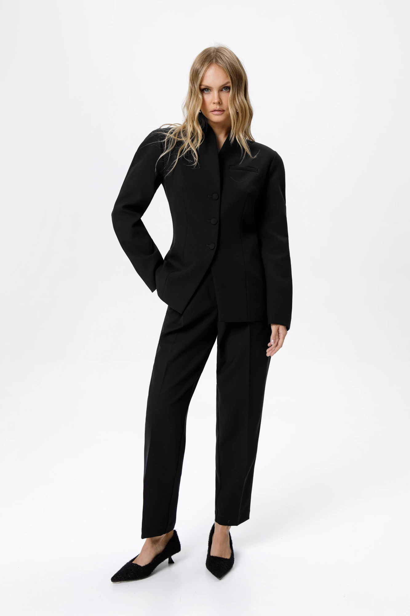Костюм-двойка из приталенного жакета с акцентными плечами и укороченных классических брюк со стрелками.
