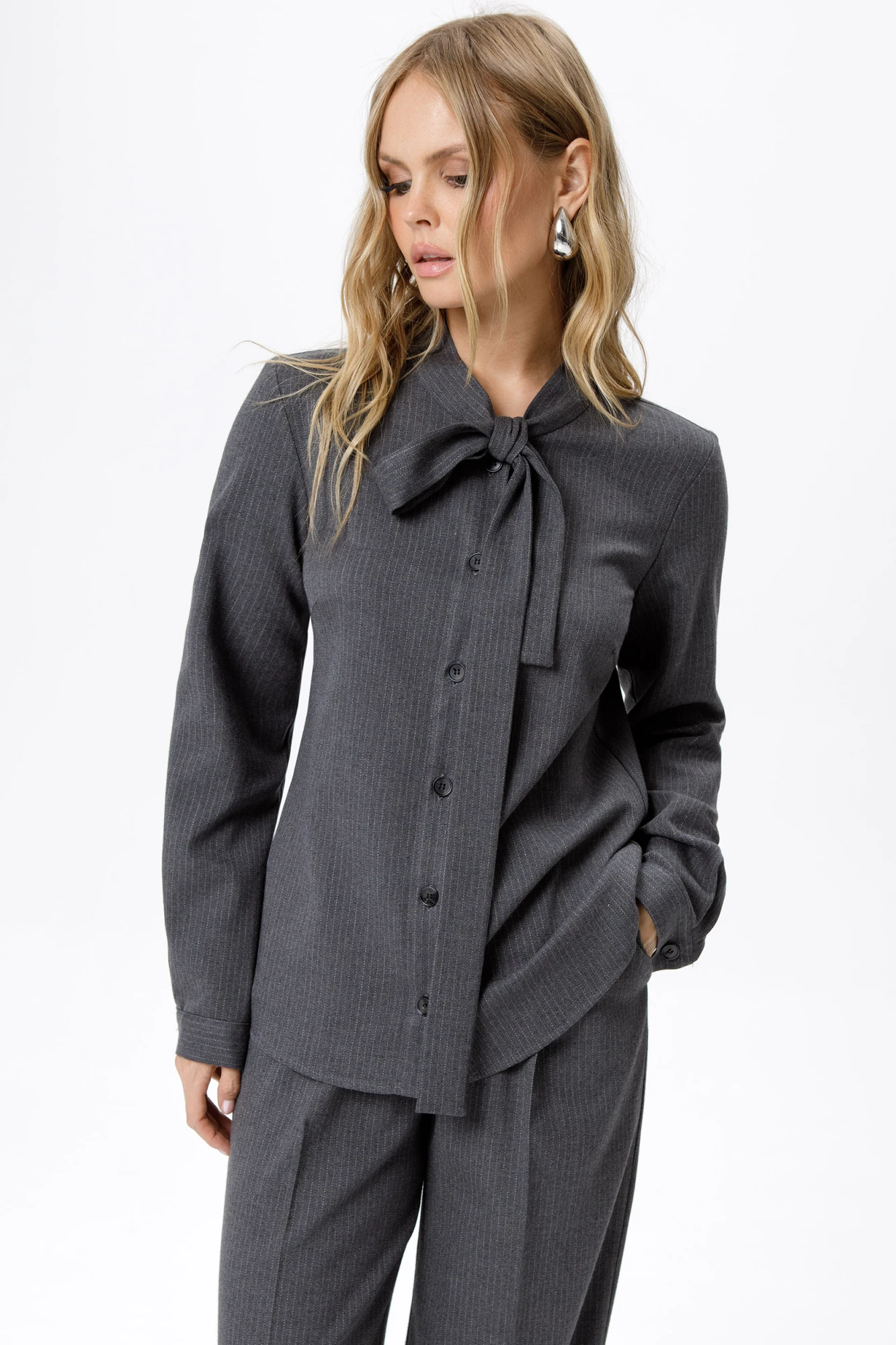 Детали: рубашка прямого силуэта, застежка на петли и пуговицы, длинные рукава с притачными манжетами. Брюки с высокой посадкой, притачной пояс со шлевками, передние половины с небольшими застроченными мягкими складками и заутюженными стрелками, застежка на молнию и пуговицу, боковые карманы.