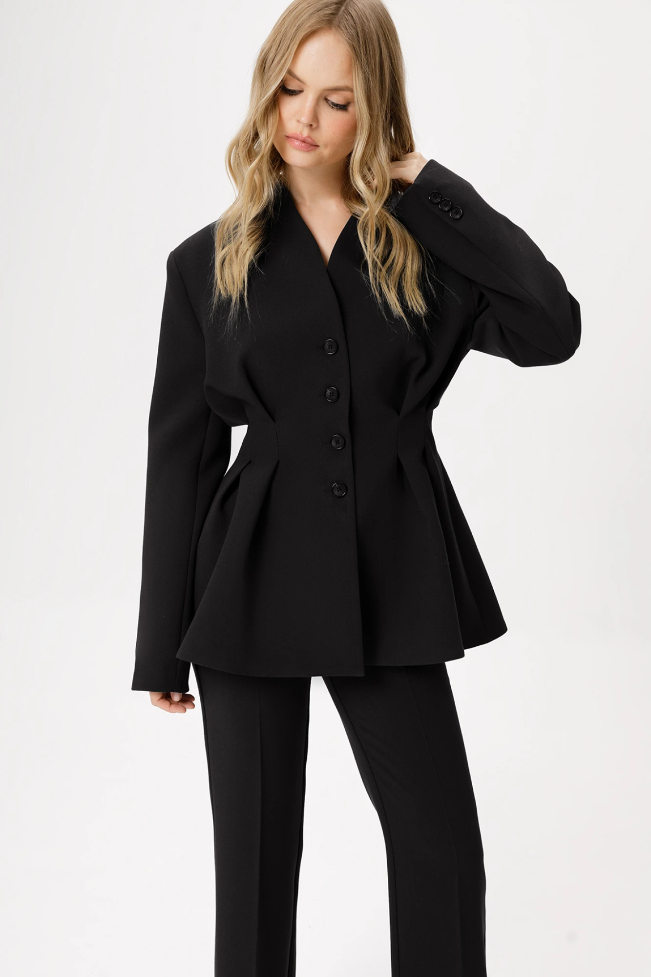 Костюм-двойка из приталенного жакета со складками и брюк-клеш со стрелками.